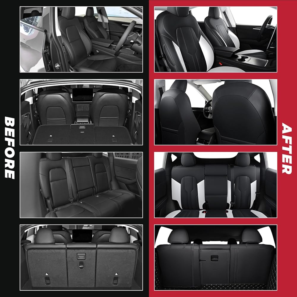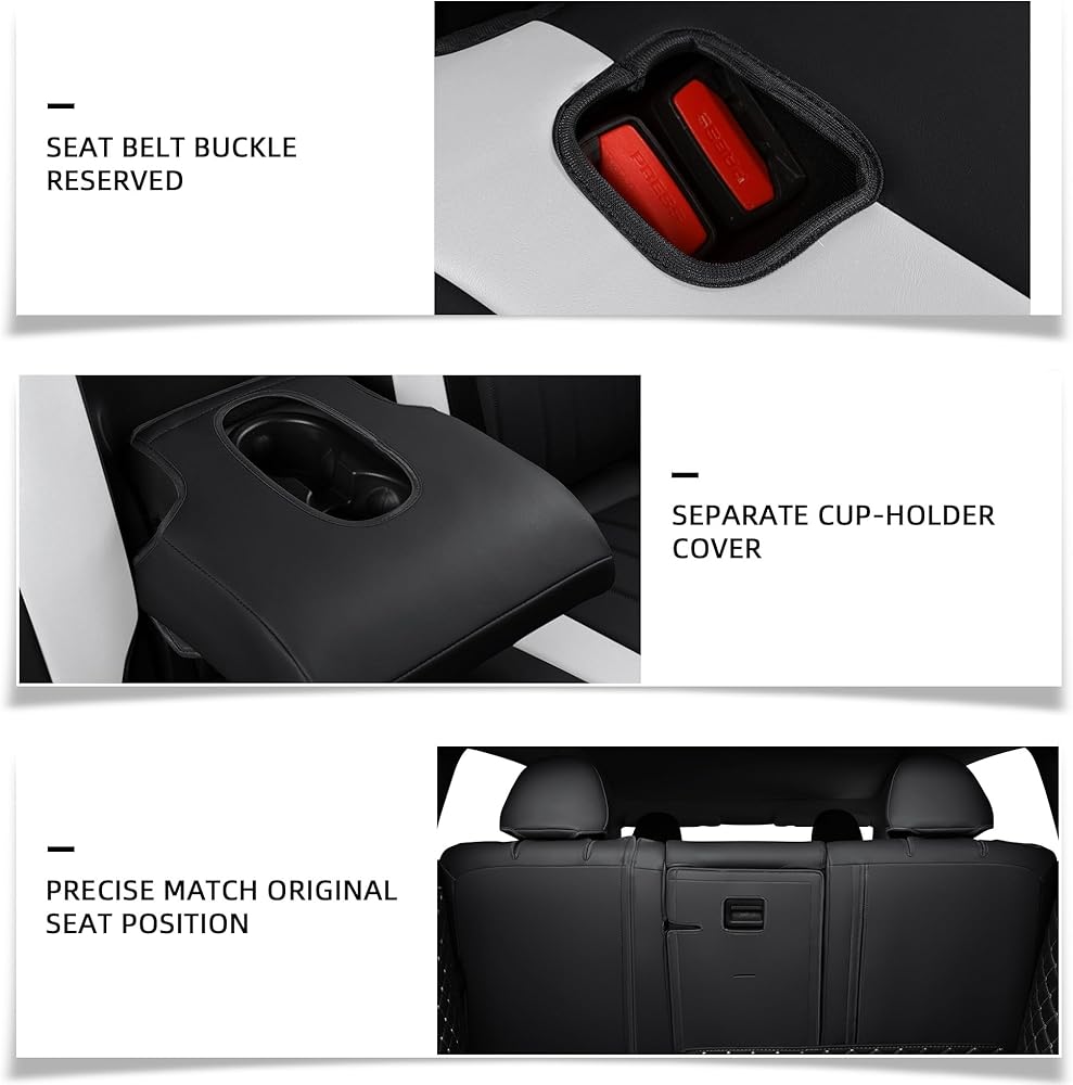 🚗Safety and Convenience - Customized to fit all exact contours , Tesla Model Y seat covers are compatible with airbag and armrest, seat belt buckle also reserved; rear armrest with cup holder cut out cover can be used independently.
