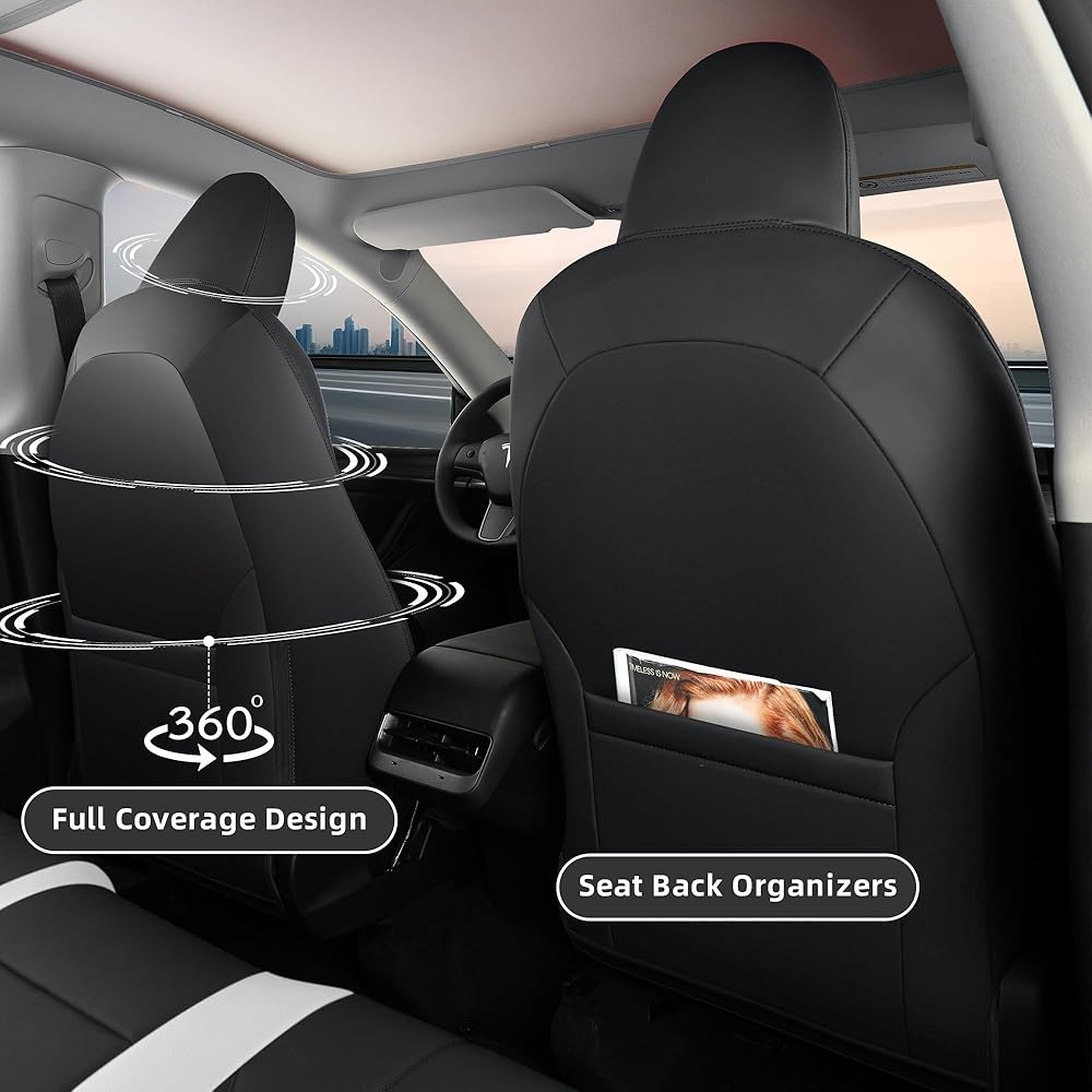 🚗1: 1 Full Coverage - Customized fit for Tesla Model Y seat covers 2024 2023 2022 2021 2020 5 seater. Car seat cover is molded with original 2023 Model Y data, using high-precision counting technology for maximum accuracy and coverage compared to OEM seat covers.