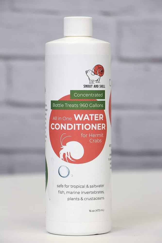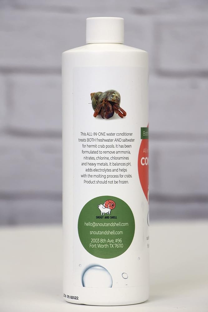 All-in-one water conditioner treats BOTH freshwater AND saltwater for hermit crab pools. Chemically formulated to remove Ammonia, nitrates, chlorine, chloramine and heavy metals. Our all in one balances pH, adds electrolytes, and helps with the molting process for crabs.