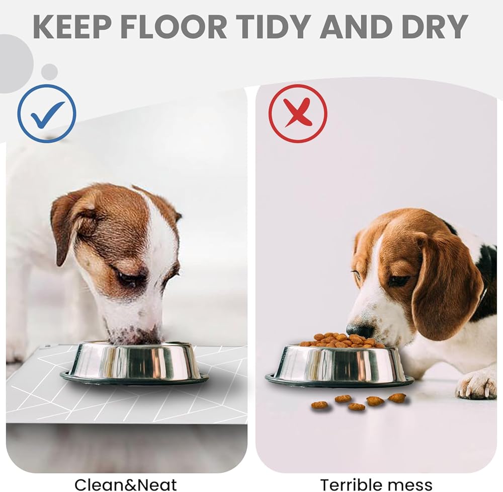 [EASY TO USE]: Great mat for holding cats and dogs' bowls, feeder, drinking fountains, stands, station, dish. Smooth surface is also better at preventing dog bowls from sliding due to a stronger contact with the bowl. No more messy spills on floor again. Anti-slip, Non-skid, Waterproof, Durable, Flexible, Soft, and easily taken anywhere for travel.