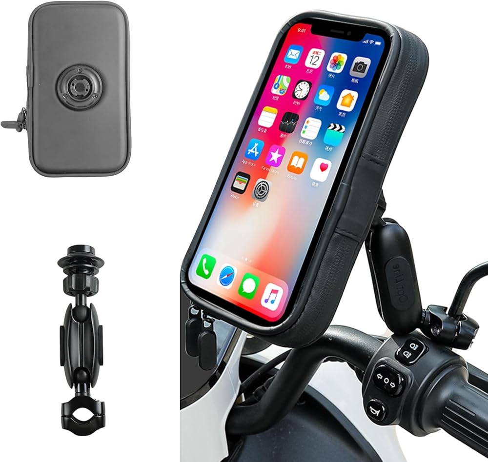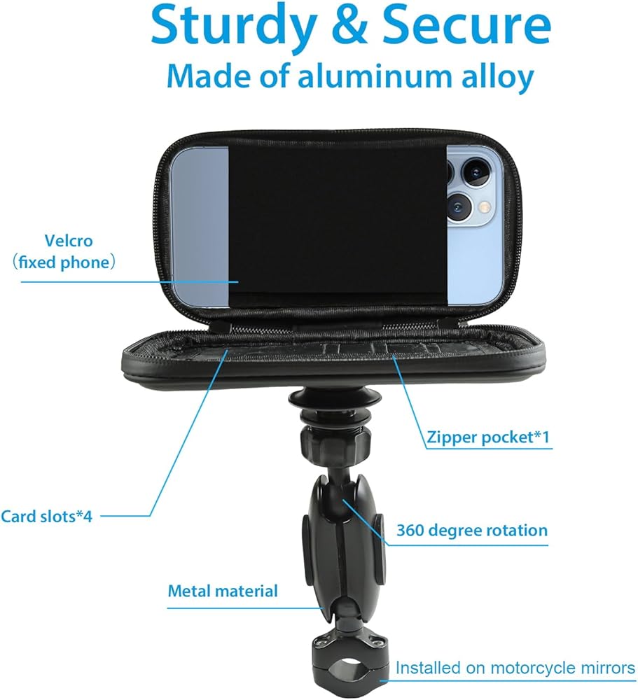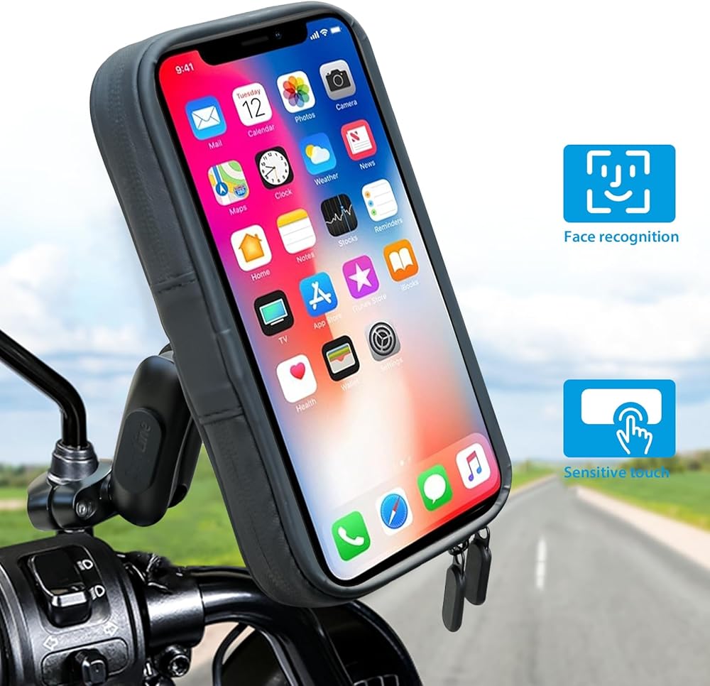 حقيبة مقاومة للماء للهاتف للدراجات النارية من SUNDAREE مع مشبك حامل مرآة من الألومنيوم، حامل هاتف دراجة نارية يدور بزاوية 720 درجة لهواتف iPhone 15 Pro Max/Plus و14 Pro Max والمزيد من الهواتف الذكية مقاس 4.7 بوصة إلى 6.8 بوصة