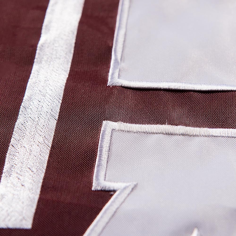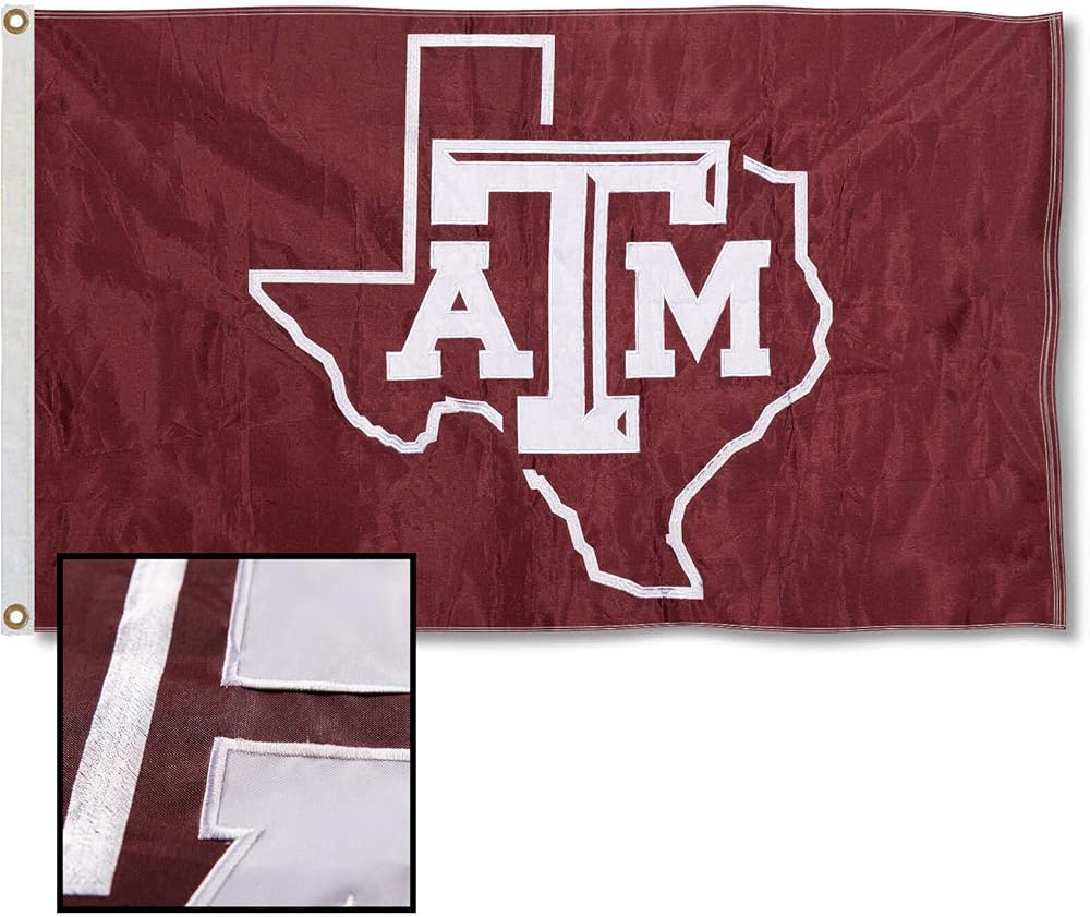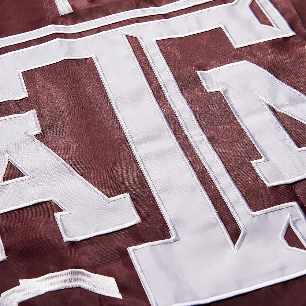Our Flag, Banner or Pennant measures 3 ft x 5 ft in size, has Quadruple Stitched fly ends, is made of durable Nylon, and has two Metal Grommets for attaching to your flagpole. The Embroidered and Appliqued Texas A&M logos are applied via our 2-patch method, therefore, one patch is sewn on each side of the flag. These flags are Officially Licensed and College, University, or Team Approved and are Viewable from Both Sides (Opposite Side is a Reverse Image).