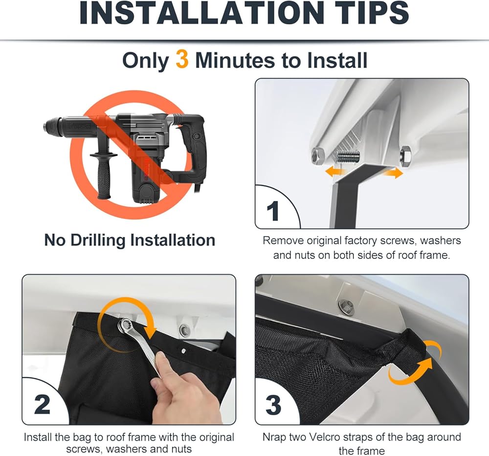 【سهلة التركيب بدون حفر】باستخدام البراغي الأصلية وأدوات التثبيت ذات الخطاف والحلقة، يمكنك ربط الحقيبة بأمان على سطح عربة الجولف الخاصة بك دون حفر أو إتلاف الجسم. وهذا يضمن إعدادًا خاليًا من المتاعب يستغرق 3 دقائق فقط، مما يسمح لك بالاستمتاع بمساحة تخزين إضافية في عربة الجولف الخاصة بك