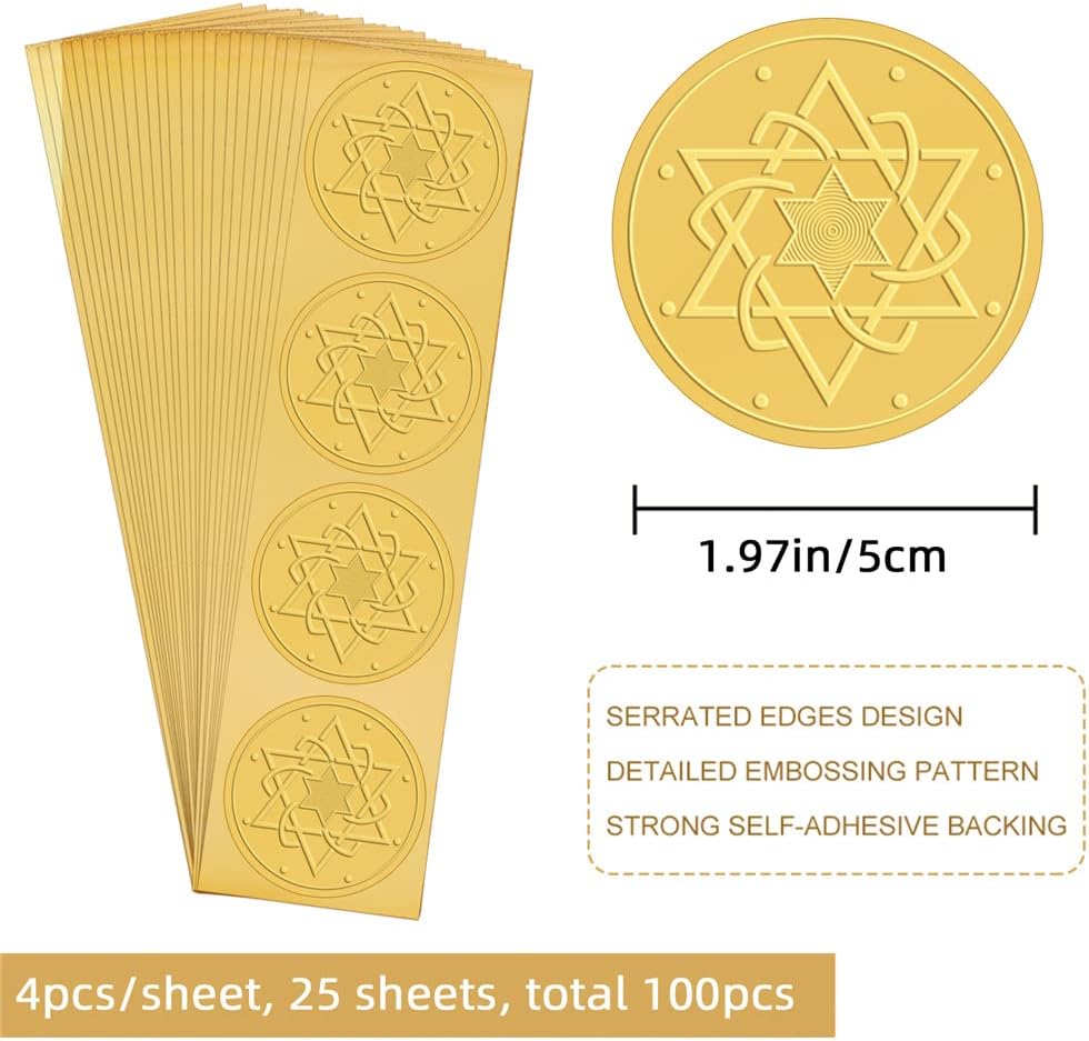 Envelope Seals Stickers: The star of David embossed pattern, self-adhesive backing, shimmering & shiny, smooth edge and nice texture.