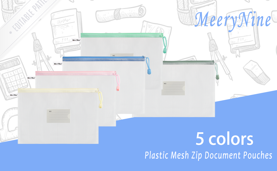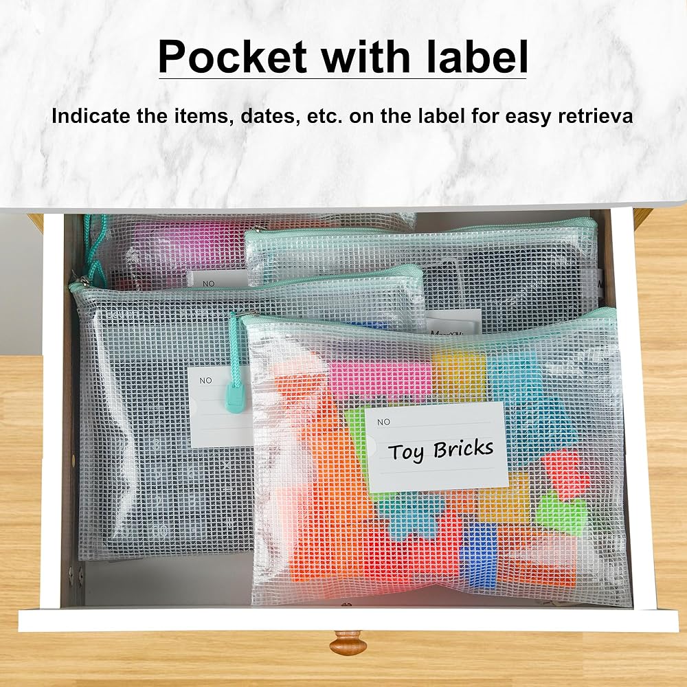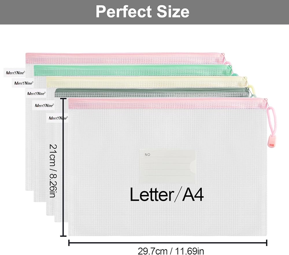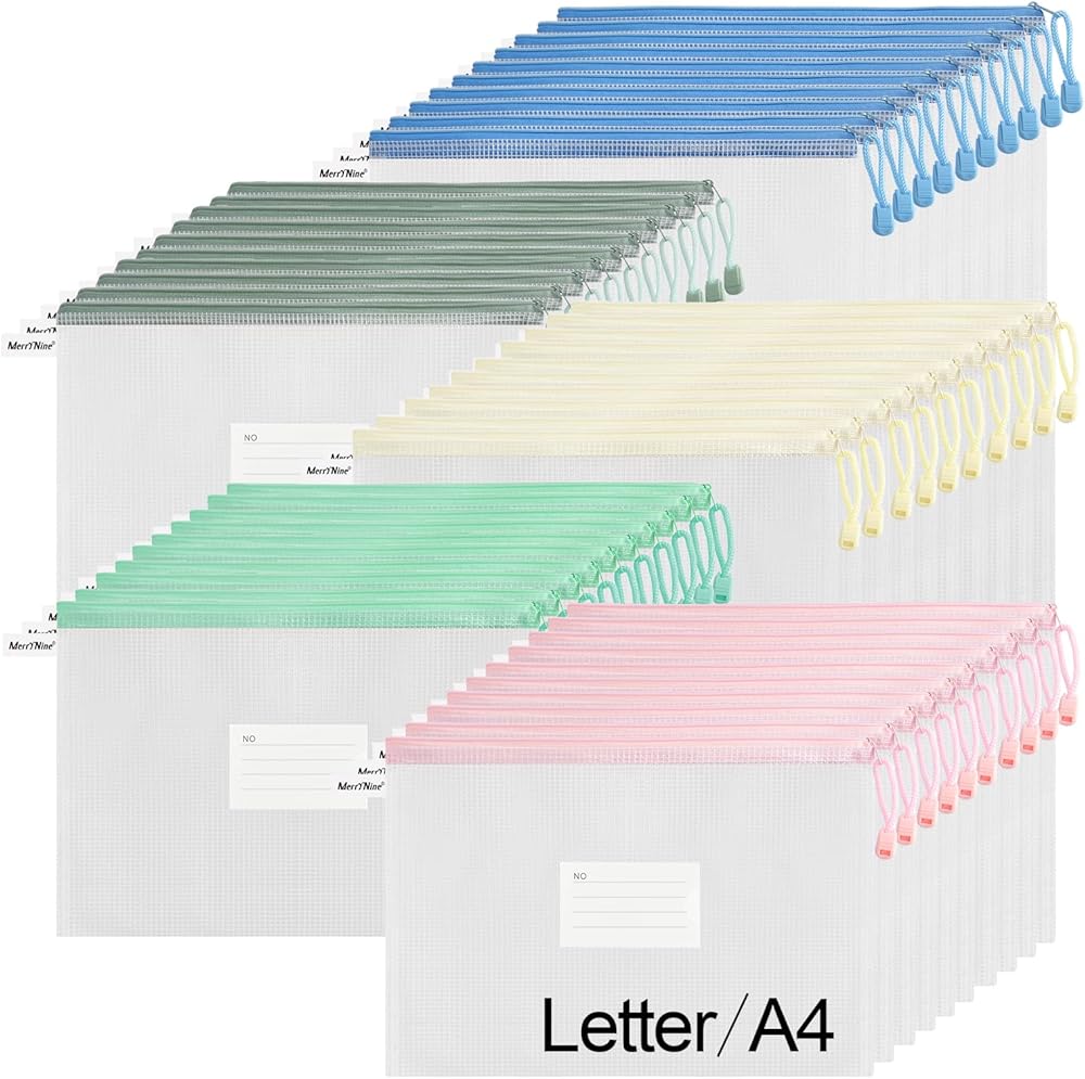 MerryNine 50 قطعة من أكياس الحقيبة الشبكية بسحاب لحروف A4، أكياس شبكية بلاستيكية مع سحاب لتنظيم لعبة الألغاز وتخزين ملفات الفصل الدراسي، حقيبة ملفات مقاومة للماء قابلة لإعادة الاستخدام مع ملصق، ألوان مختلطة