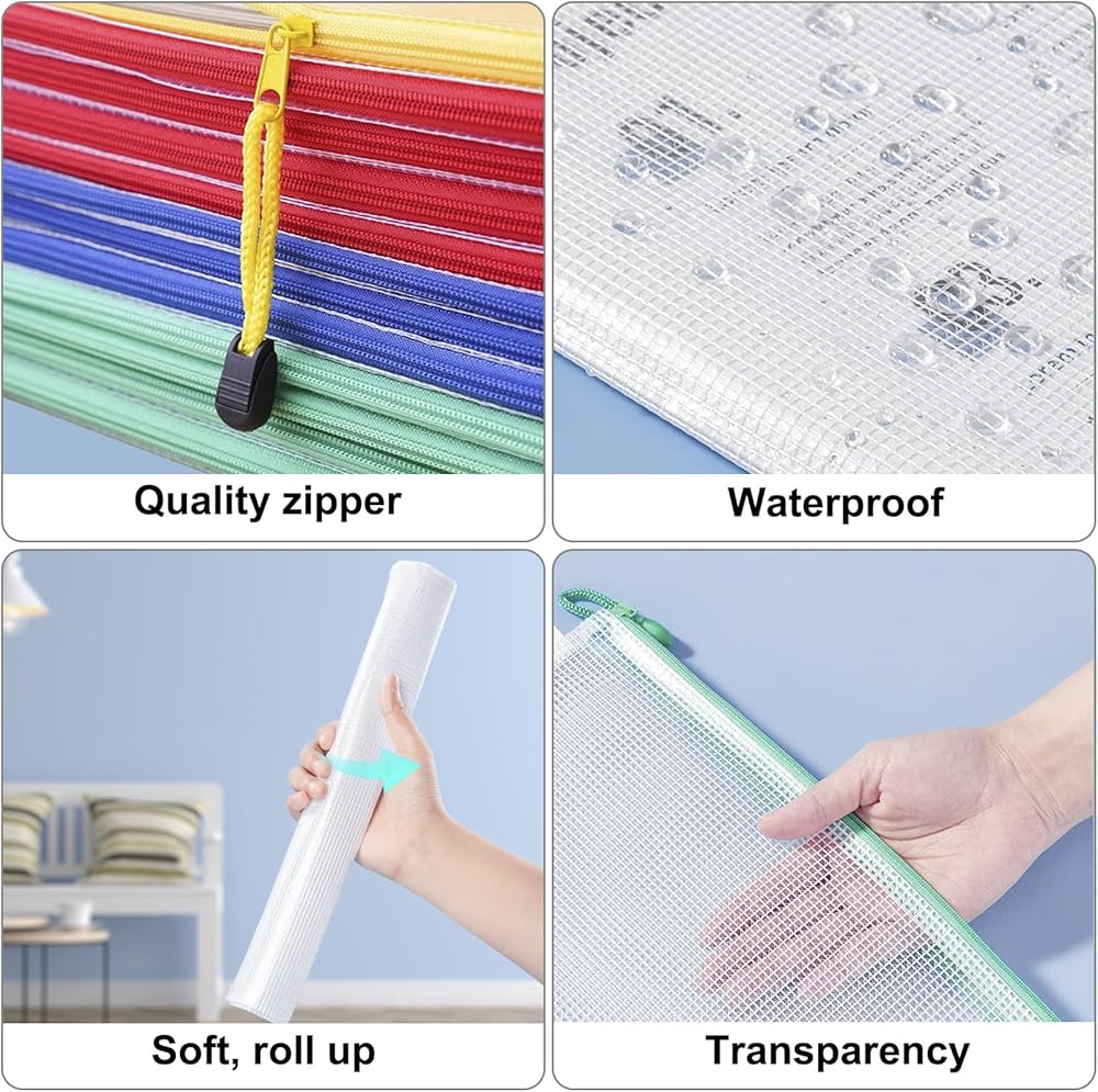 【مواد عالية الجودة】مصنوعة من شبكة بولي كلوريد الفينيل الآمنة والمتينة، الشبكة السميكة المزودة بسحاب مقاومة للماء والرطوبة، والتي يمكن أن تحمي مستنداتك من الرطوبة وتبقيها مسطحة وواضحة. السحابات المعدنية الناعمة قوية ومتينة.