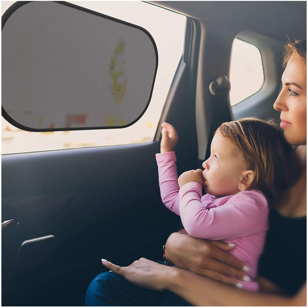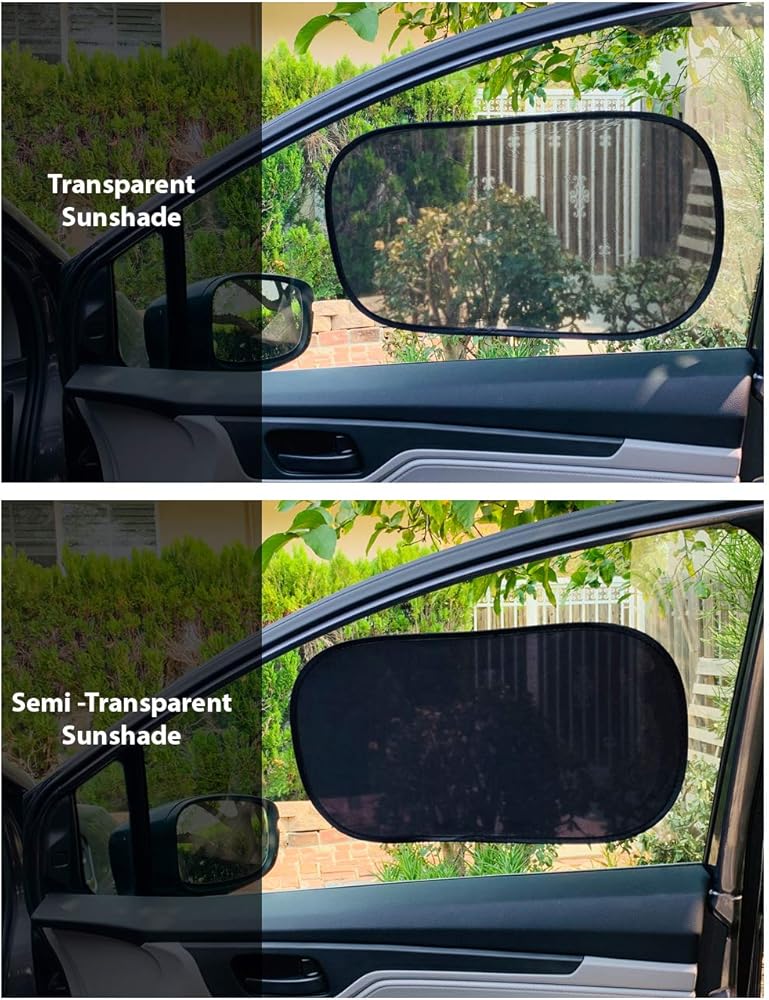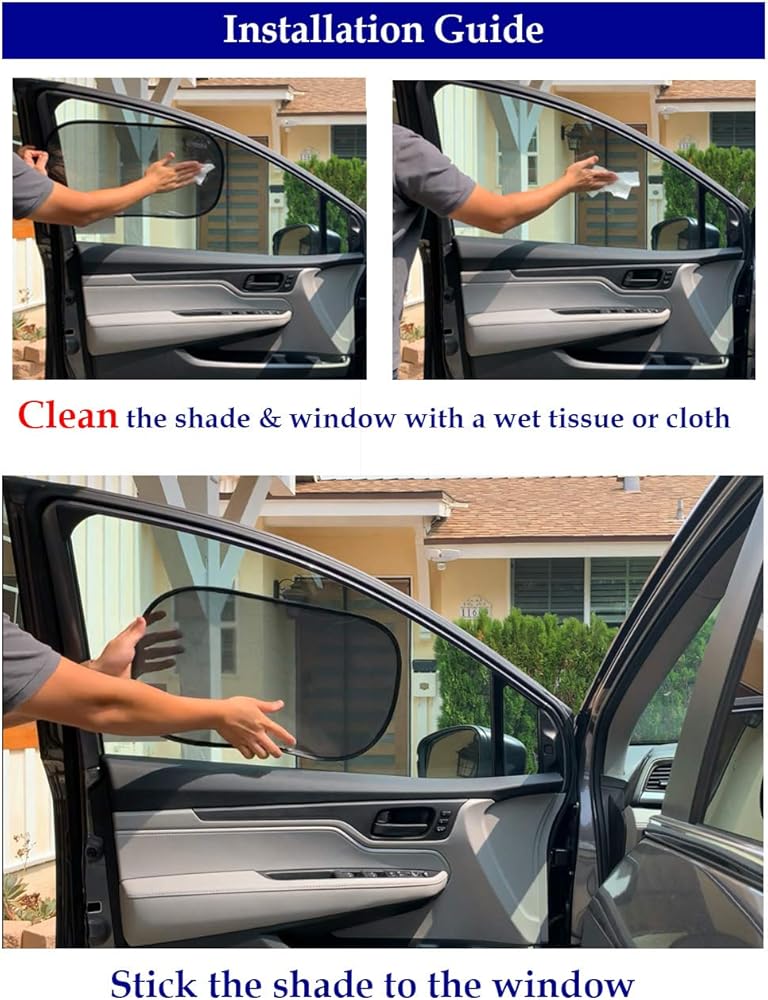 - Easy to install - You do NOT need any suction cups, sticky, tape. Just clean and dry desire area with any cloth, then place the sunshade, run your hand across so it can cling. Done! - Sunlight protection - Need solar visor for side window? Polyester Fabric sunshades blocks most of the sunlight glare. It keeps cool seat of your vehicle while traveling. It will become your sunlight protector especially the car window that are not tint. - Dark and light - It comes with 2 Dark and 2 Light mesh sunshade. Depends on your needs, you can put light or dark on your side of window. - Easy to store - If you want to put it away for moment, you may fold and put them in a storage bag included. Keep it in your car as your favorite car accessories or travel accessories. - Widely cover any type of car rear window - The shade is bigger than general shade. can be covered side window up to Mid-Size Sedan and SUV (L=20.5 inches H=12 inches)