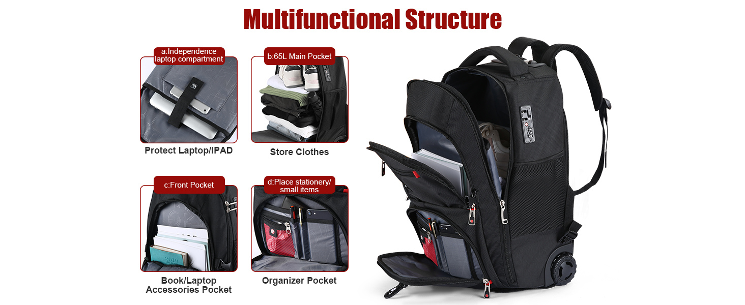PROTECTIVE MATERIAL: This wheeled backpack is well made of durable tear and dirt resistant polyester fabric. The wheeled backpack with a plastic panel corner guard at the bottom and the back cover cushion is designed for strong rubber wheels protection. Every compartment has sturdy lockable zippers that greatly secure your valuable items. Best choice for mothers day gifts, teacher's gifts, birthday gifts, travel gift.