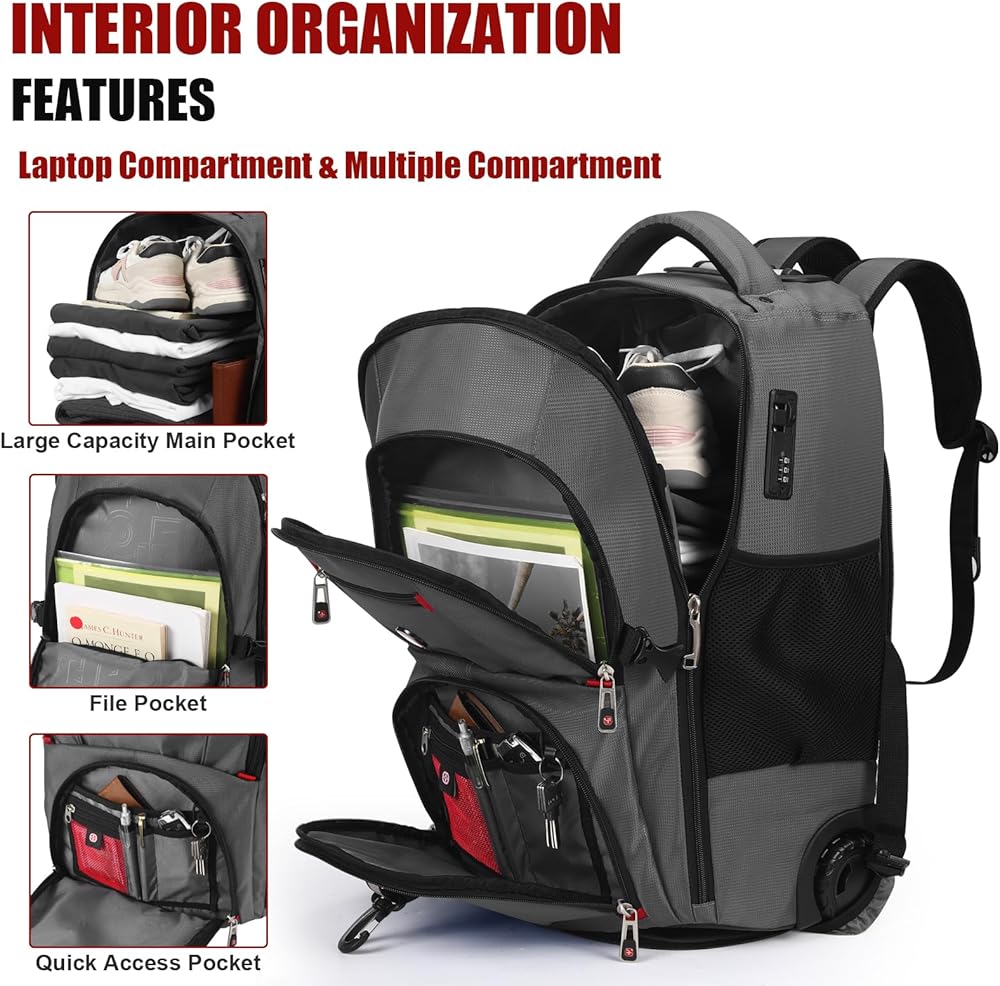 CARRY-ON DESIGN: Crafted to meet the size requirements of most airlines, this backpack with wheels measures at a convenient 22x14x9 inches or slightly smaller, ensuring it fits in overhead compartments with ease. Ideal for those quick getaways or business trips, it's the perfect companion for travelers aiming for efficiency and style on short journeys.