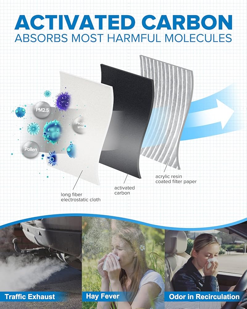 استمتع بالهواء النقي: يمتص فلتر هواء كابينة الكربون المنشط الروائح الكريهة بسرعة من خارج نظام التهوية، ويوفر بيئة داخلية أكثر راحة للسائق والركاب دون إضافة معادل للروائح الكيميائية.