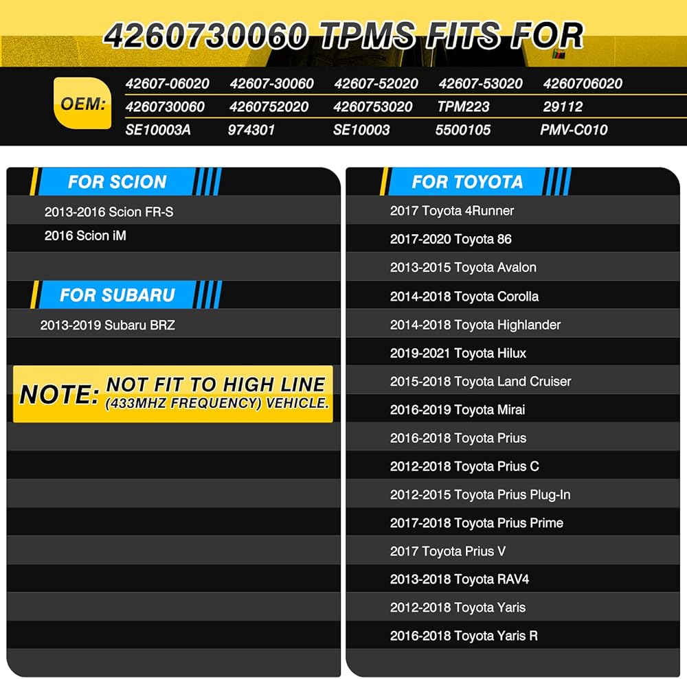 【Replace OE Number fit for TOTOTA Tpms Sensor 】: 42607-06020 42607-30060 2607-52020 42607-53020 PMV-C010, 42607-33040, 42607-0R020, 42607-30100, 42607-0D010, 42607-52010, 42607-06060. Compatible with Toyota Hilux 2019 2020 2021►Toyota 86 2017 2018 2019 2020►Toyota Mirai 2016 2017 2018 2019►Toyota Yaris R 2016 2017 2018►Scion FR-S 2013 2014 2015 2016►Scion iM 2016►Subaru BRZ 2013 2014 2015 2016 2017 2018 2019 (Note: Not fit to car which is 433MHz frequency.)