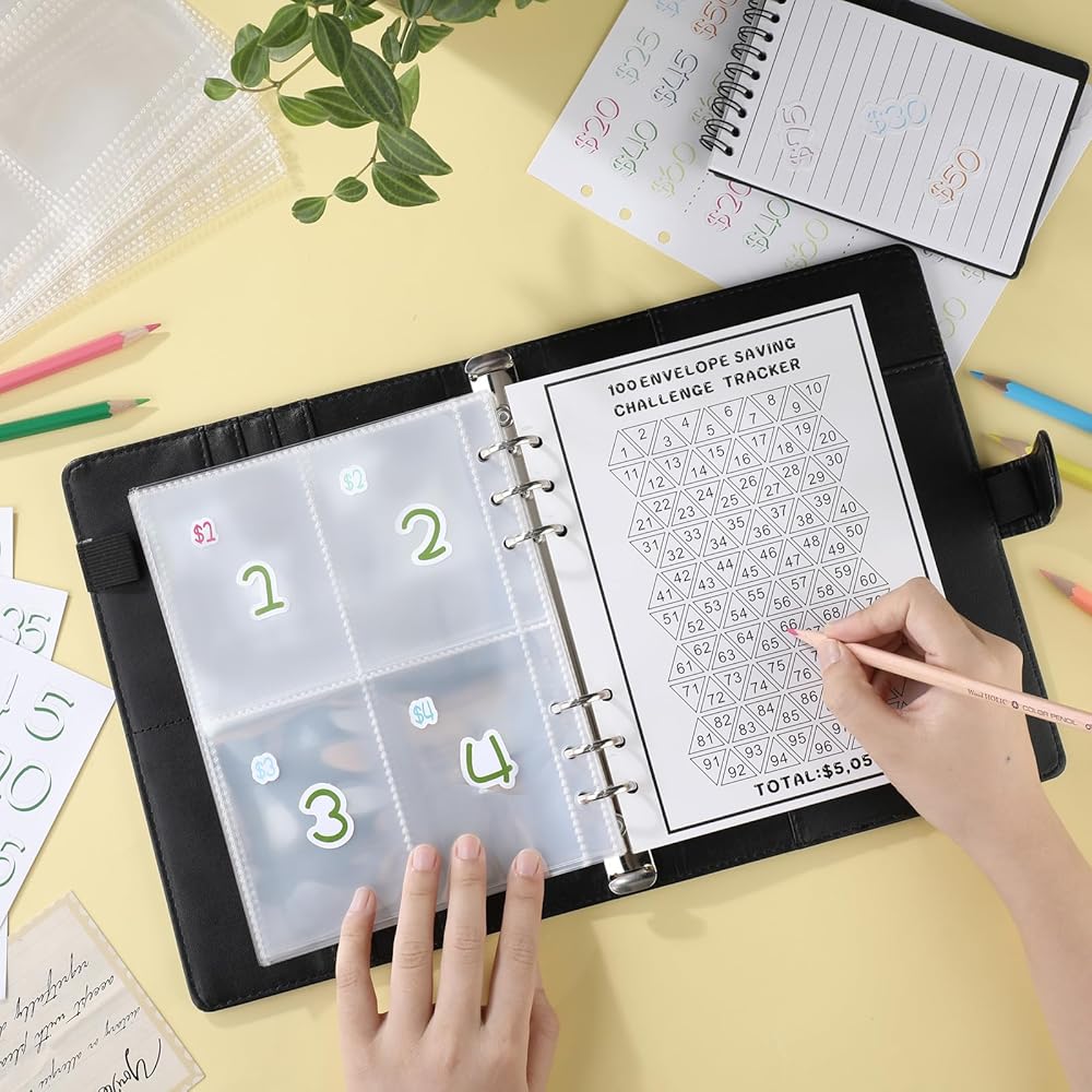 مجموعة شاملة لتوفير الأهداف: تأتي العبوة كاملة مع غلاف تحدي مغلف يحتوي على 100 ظرف، ومجهز بمتتبع مصفح قابل لإعادة الاستخدام، و25 ورقة تخزين مع 1-100 حقيبة صغيرة، و1-100 ملصق رقمي، و1-100 دولار ملصق رقمي، مما يضعك على المسار الصحيح لتوفير 5050 دولارًا بطريقة ممتعة وجذابة؛ تم تصميم هذه الميزة لجعل توفير المال ليس فقط أكثر قابلية للإدارة ولكن أيضًا أكثر متعة
