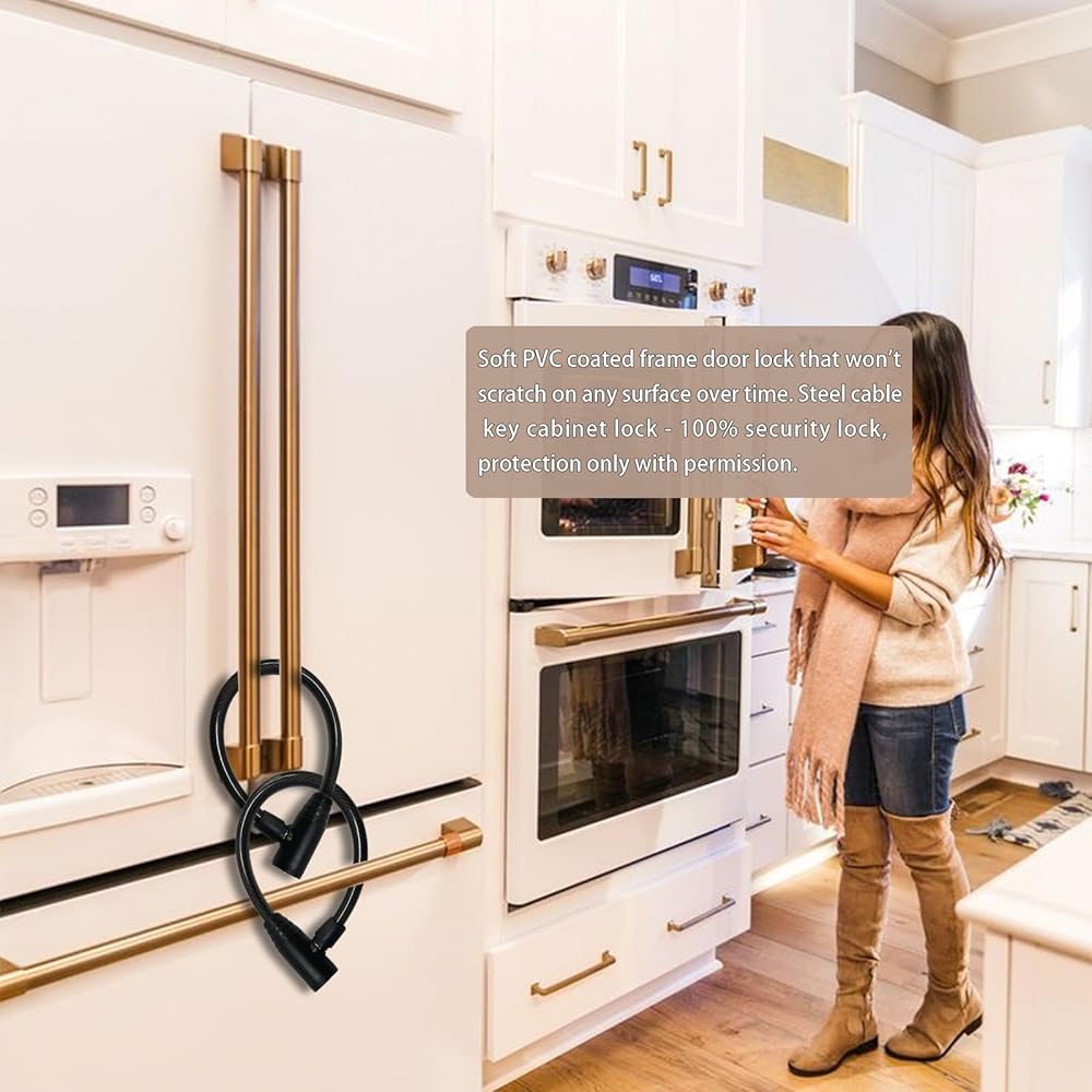 متينة: غطاء قفل خزانة الثلاجة الخاص بنا مصنوع من طلاء PVC الناعم، وهو متين وسهل الحمل.