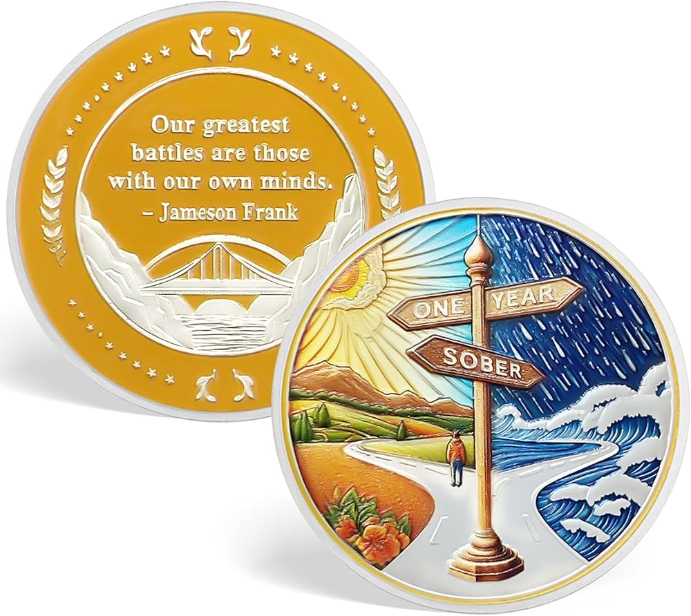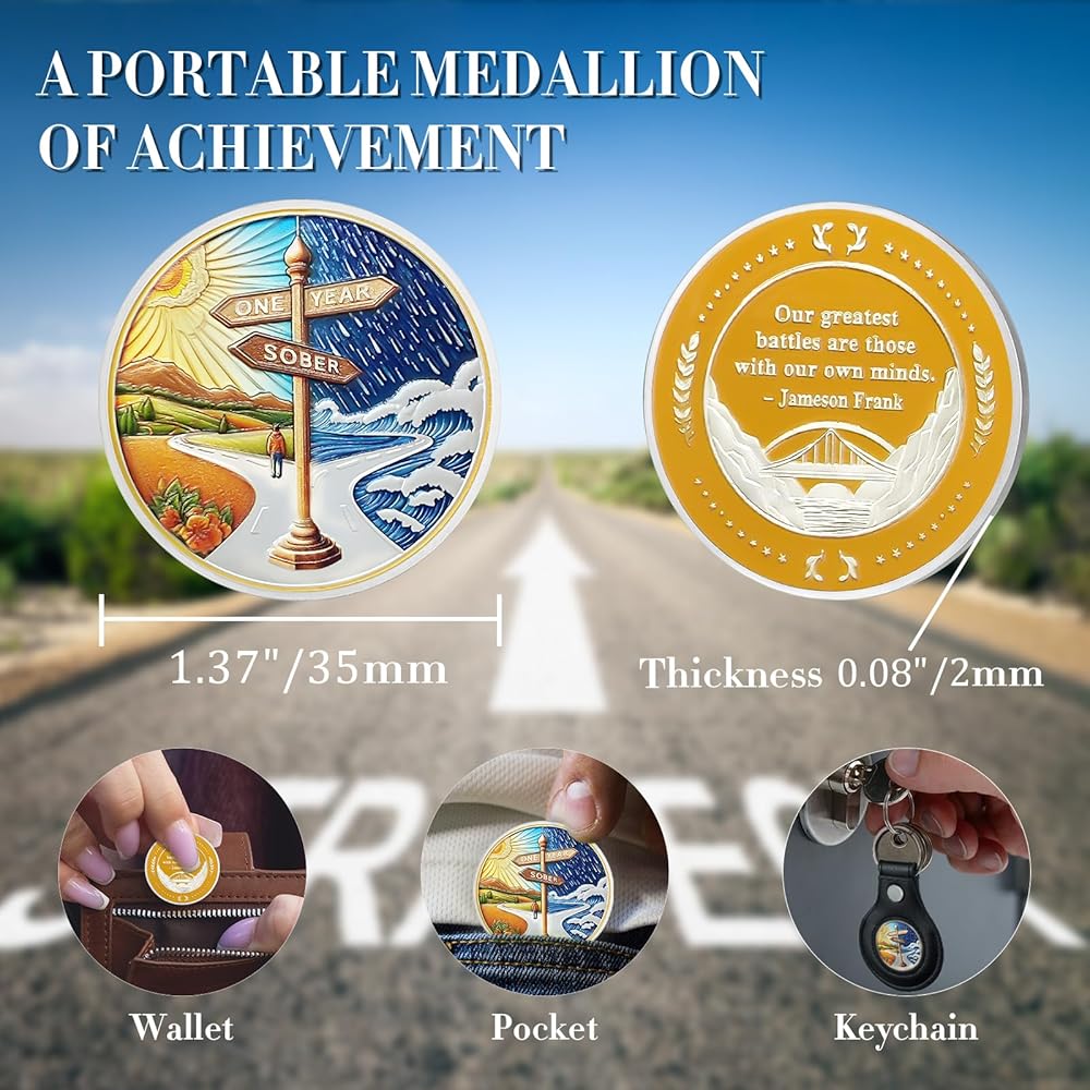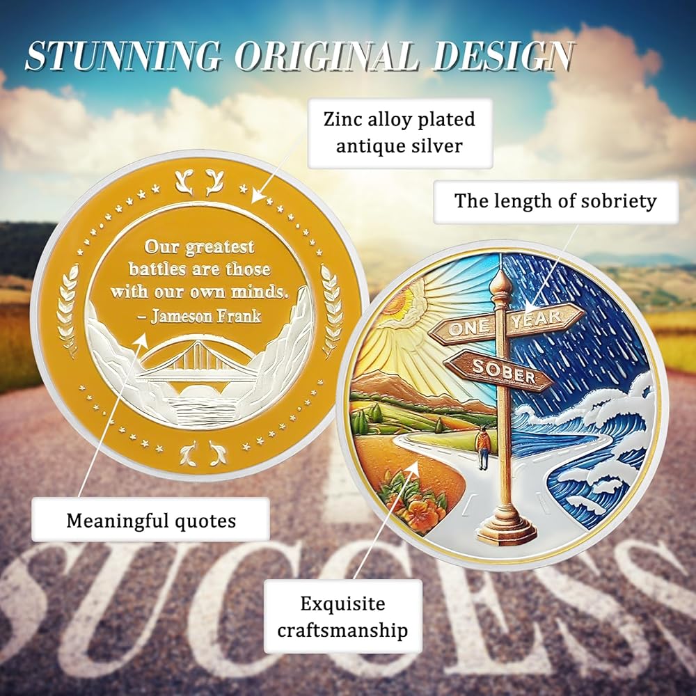 【تصميم مصنوع بشكل رائع】الجزء الأمامي من عملة الرصانة لمدة عام واحد مقسم إلى قسمين بواسطة علامة مركزية. على اليسار، يرمز المشهد الهادئ إلى السلام الذي يجلبه الرصانة، بينما على اليمين، ترمز البحار العاصفة إلى التحديات. الصور تصور الأفراد في طريقهم إلى الرصانة، تاركين وراءهم الظلام من أجل مستقبل أكثر إشراقا. يحتوي الجزء الخلفي على اقتباس "أعظم معاركنا هي تلك التي نخوضها مع عقولنا". بقلم جيمسون فرانك، يحث الأفراد على التحكم في أفكارهم من أجل الرصانة الدائمة