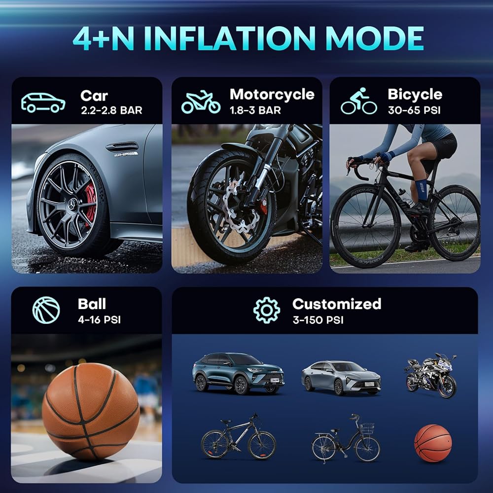 [4+N INFLATION MODE] The air pump for car tires with 4+N preset inflation modes (Cars, Motorcycles, Bikes, Basketballs and Customization) and 4 preset units (PSI, KPA, BAR, and KG/CM ²) can meet the inflation needs of most products. Rest assured with the auto shutoff design. Once reaching the preset pressure value, the air compressor will automatically stop. It is an essential product for daily life and travel.