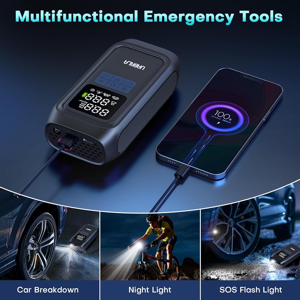 [All-IN-ONE PORTABLE AIR PUMP] The all-in-one car tire air pump portable not only provides an inflatable function, but also acts as an emergency light and a power bank. The LED light on the top of the car air pump can facilitate you to inflate or change tires in the dark. We also have extra USB-C/USB-A input and output ports, making it an emergency power supply for your phone.
