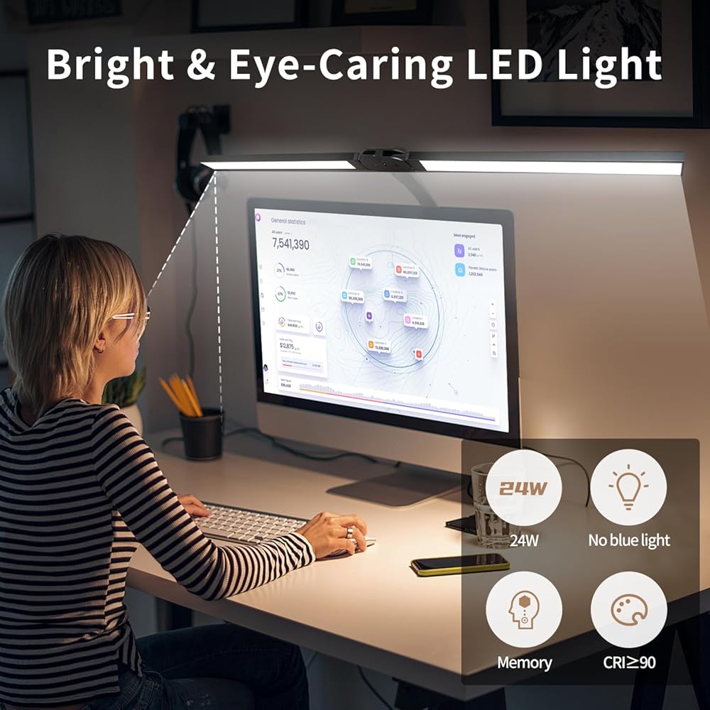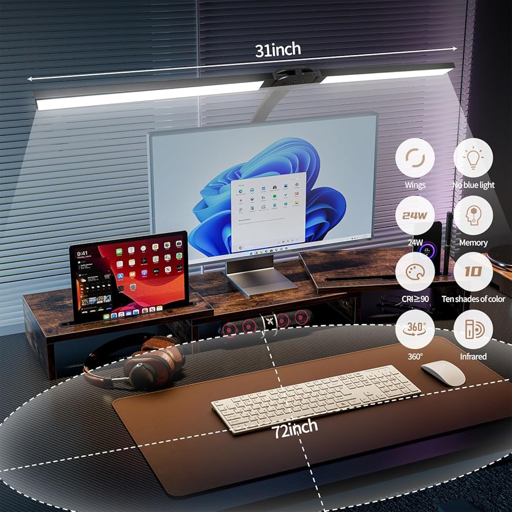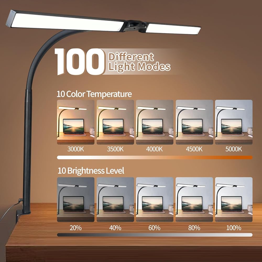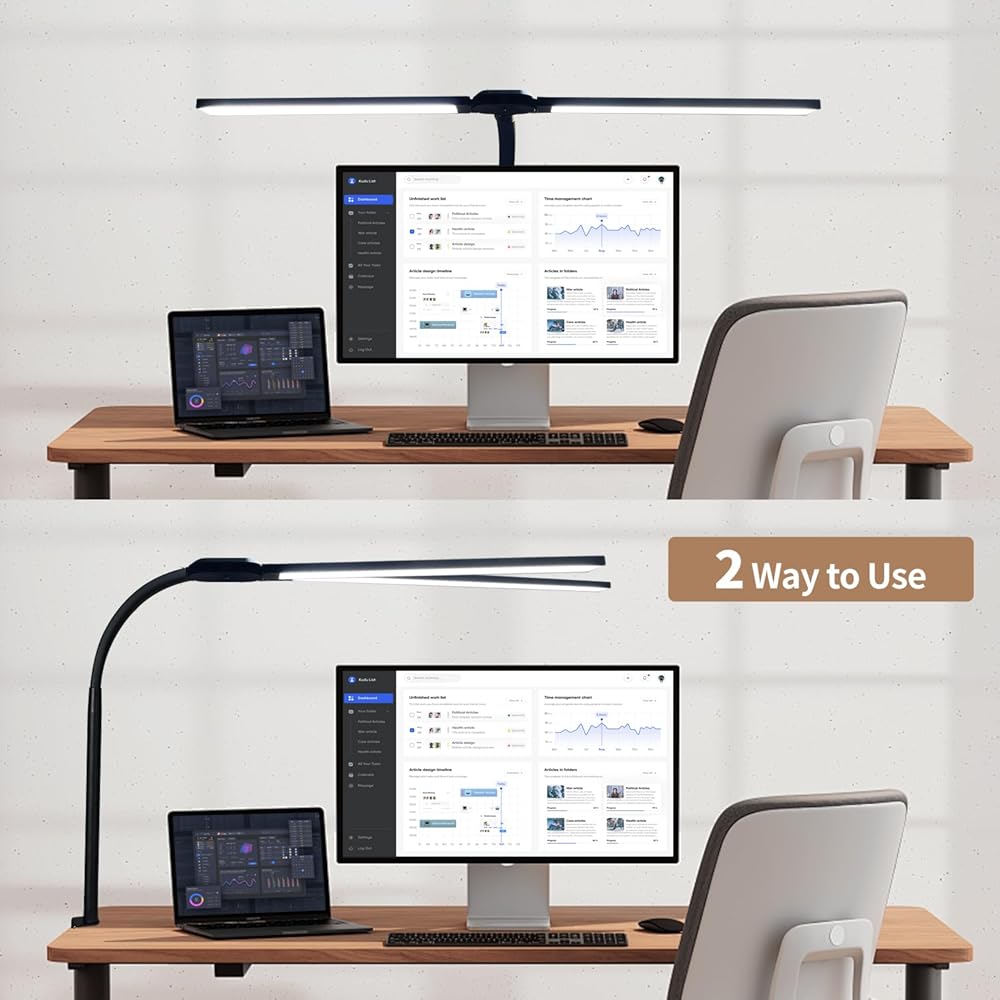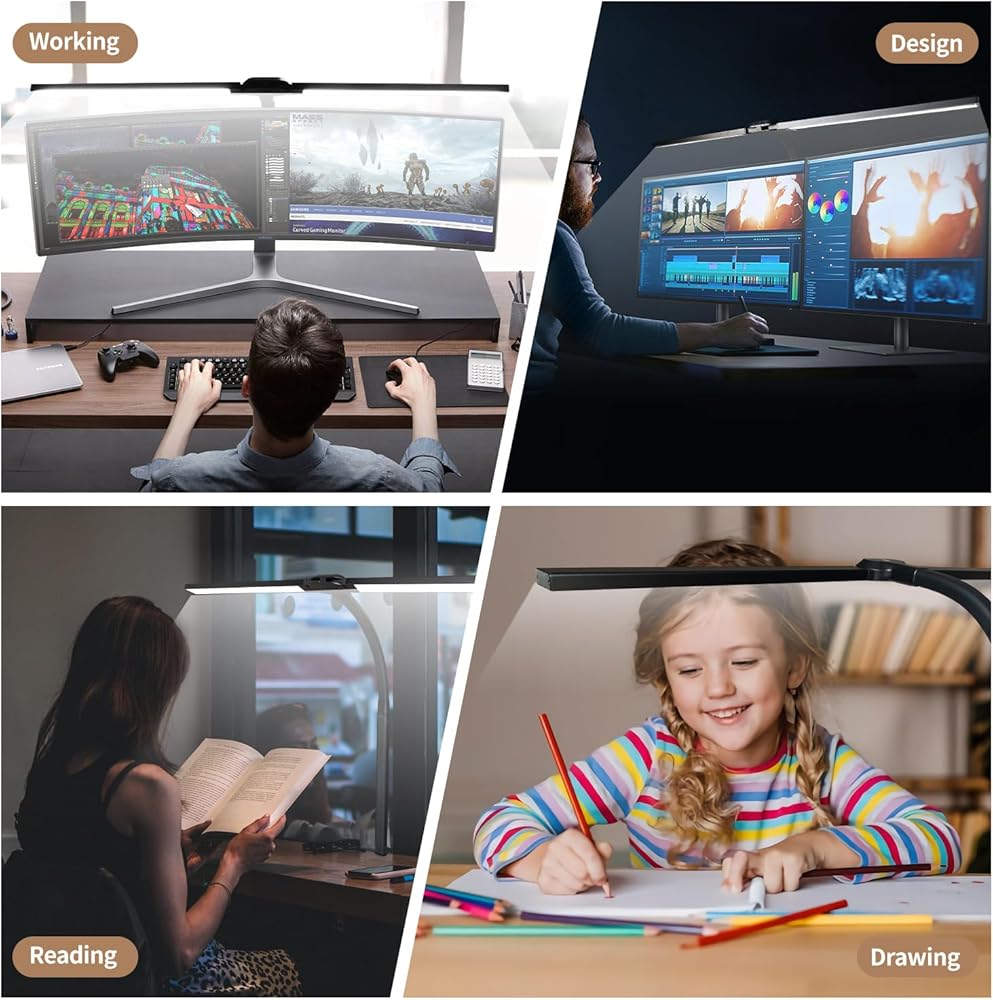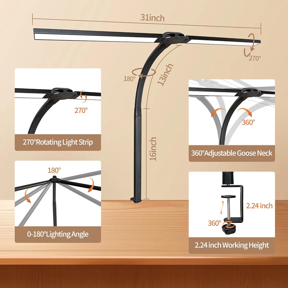 【عريض للغاية وفائق السطوع】 يتميز مصباح المكتب LED بقدرة 24 وات بتصميم رأس مزدوج يسمح لك بضبط زاوية شريط الضوء. يمكن أن يمتد الضوء إلى 72 بوصة ويضيء الطاولة بالكامل. مناسبة لمحطة العمل متعددة الشاشات، والمكتب المنزلي، والمكتب الكبير، والدراسة، والمهندس المعماري، والكمبيوتر، والرسم، والخياطة، والحرف اليدوية، والرسم، والقراءة، والألعاب، والبيانو. ارتفاع يصل إلى 32.7 بوصة. أفضل مصباح مكتبي LED للعمل من المنزل.
