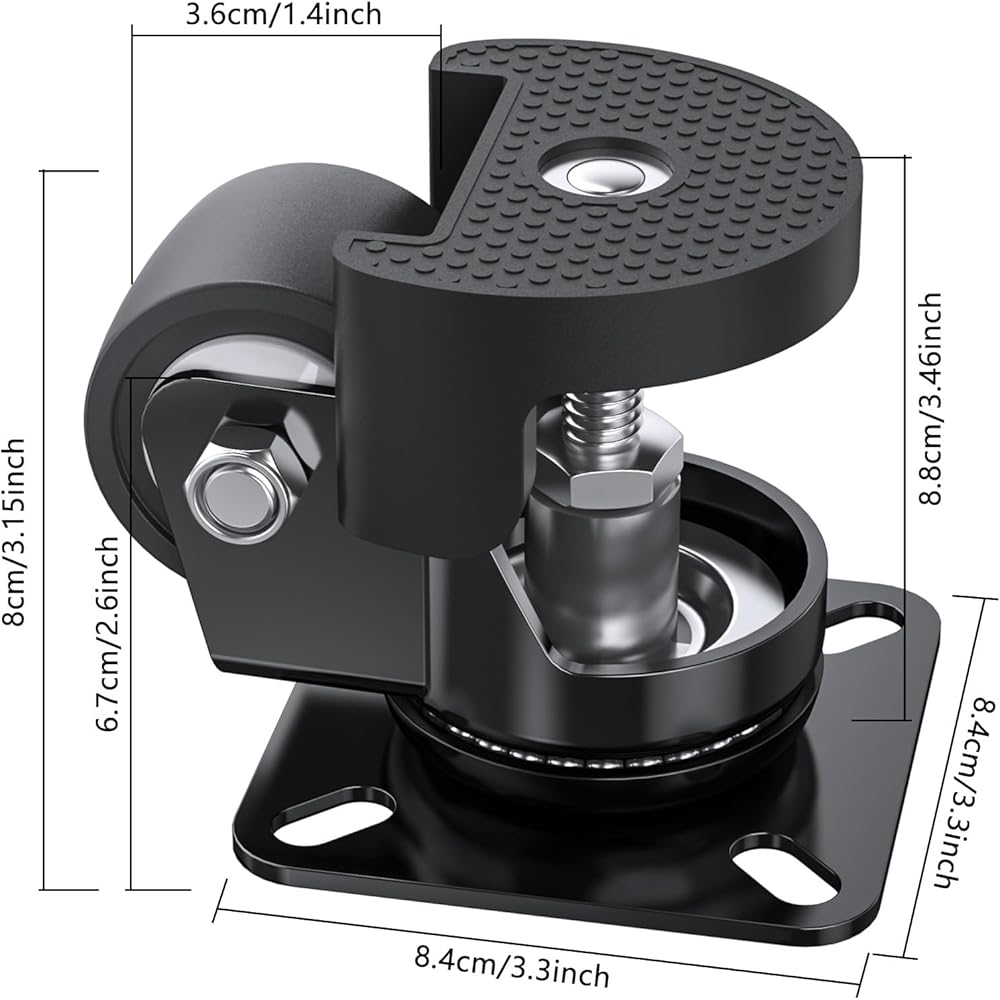 3.REINFORCED STEEL PLATE. Swivel plate of this leveling caster is specially designed to be thicker and stronger with our unique cold-rolled technology. When wheel rolling, the load capacity is 200 Lbs per caster and a total of 800 Lbs with set of 4.