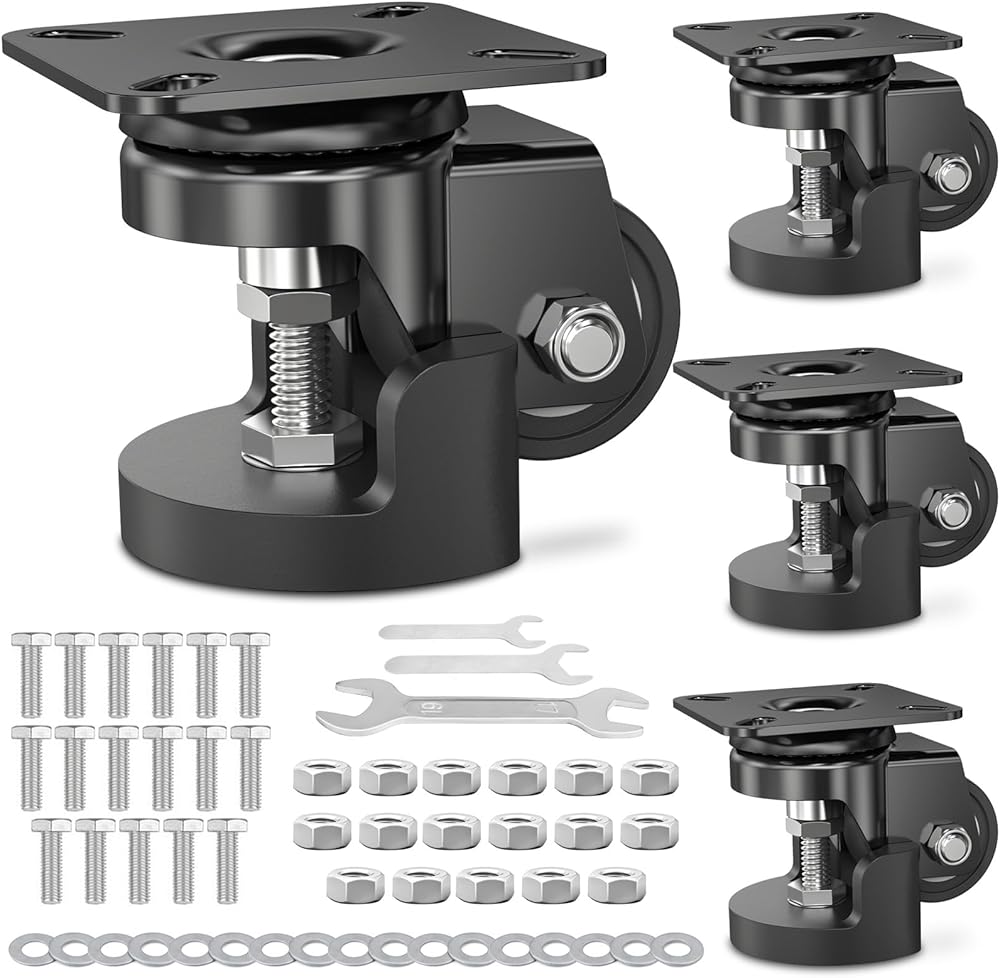 عجلات عجلات لوحة تسوية من COOWOO مقاس 2 بوصة مع وسادة قدم قابلة للتعديل ومضادة للاهتزاز وعجلات دوارة شديدة التحمل لمنضدة العمل ومعدات الماكينات والأثاث، مجموعة سوداء مكونة من 4 قطع بسعة إجمالية 1800 رطل