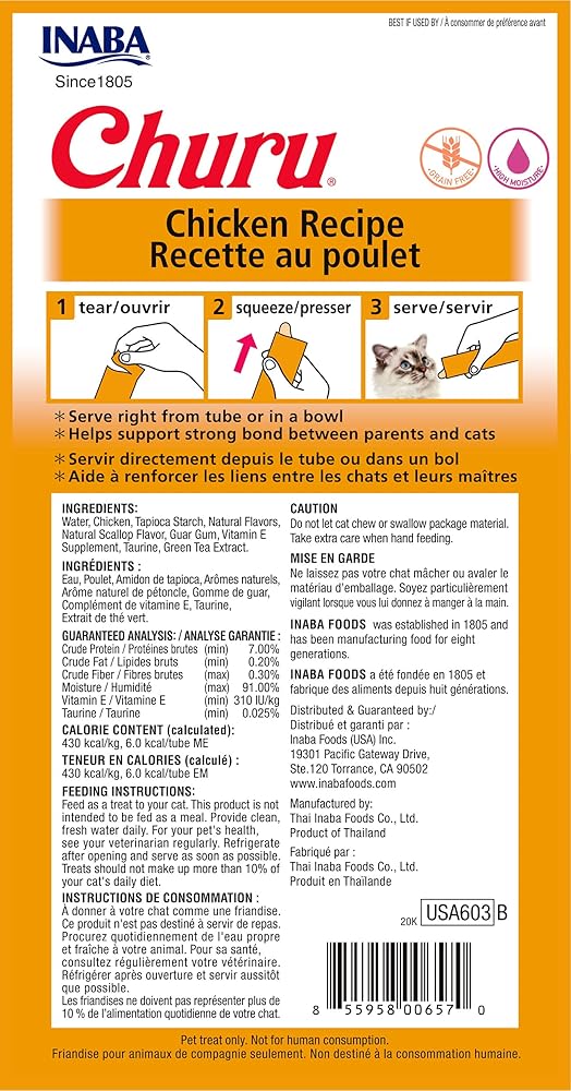 These lickable treats for cats are made with real, deep sea tuna. Churu Purées are high in moisture felines need for health. Simply tear open a tube and give it a little squeeze to feed these grain-free, preservative-free treats by hand. You can also pour them into a bowl or use as a tasty topper on wet or dry food. No grains, no preservatives, no artificial flavors or colors. Creamy texture and savory flavor cats love.