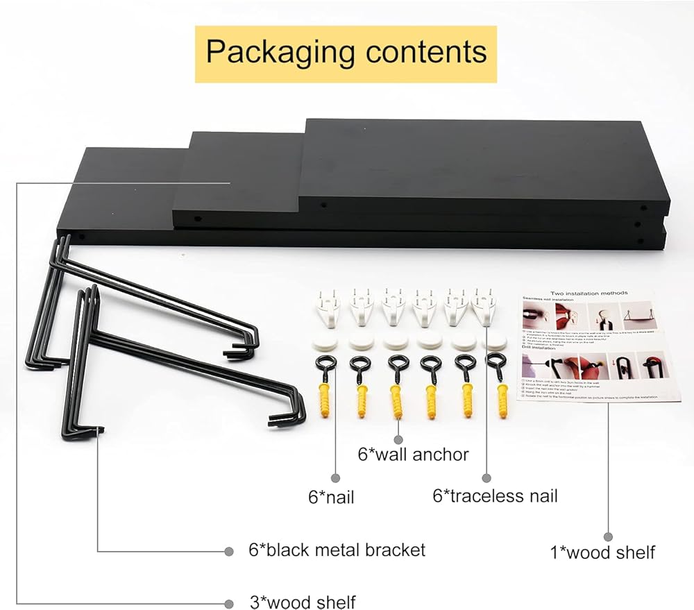 - * سهل التجميع: لا يتطلب مهارات تجميع صارمة. يأتي الرف مزودًا بمسامير وأدوات تثبيت للجدران الجافة وتعليمات، ويمكن تجميعه بواسطة شخص واحد فقط.