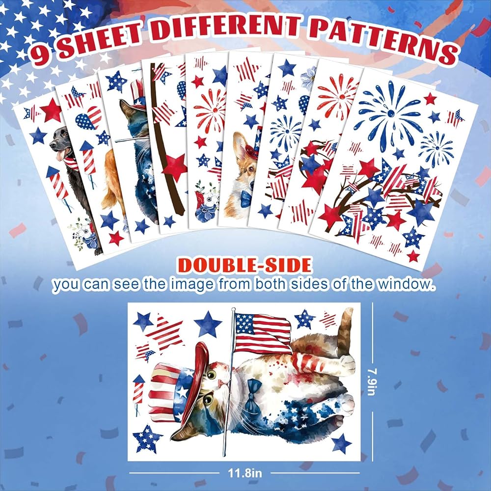 9 sheets 4th of July window clings, enough to meet your various needs, great way to prevent birds from flying into your windows and decorate your home and office.