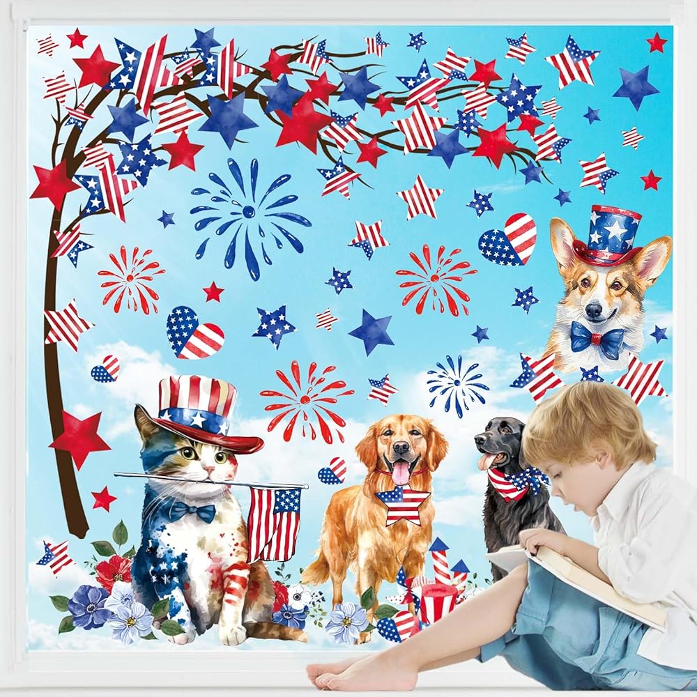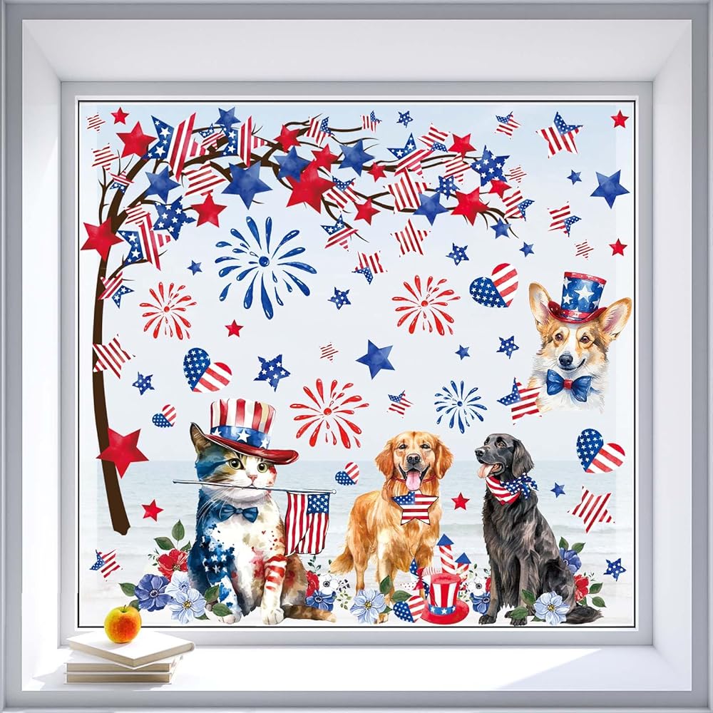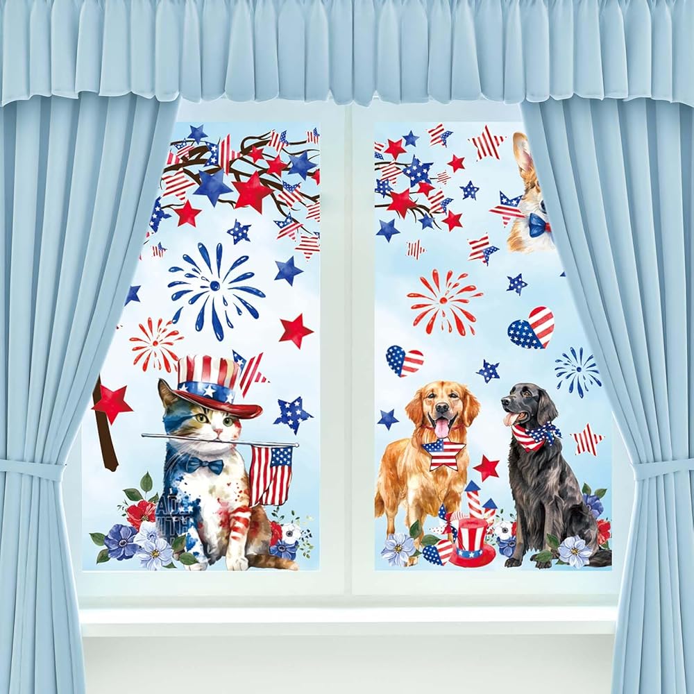 9 أوراق نافذة الحيوانات الوطنية تلتصق بالعلم الأمريكي ستار الألعاب النارية القط الكلب نافذة ملصق الرابع من يوليو نافذة ثابتة الشارات لعيد الاستقلال ديكور المنزل المدرسة الطرف