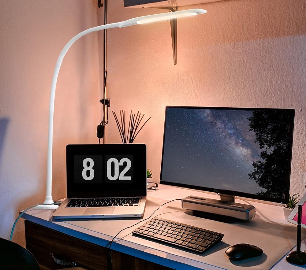 【مصباح مكتب بذراع متأرجح طويل】رقبة معقوفة مرنة وقاعدة دوارة 360 درجة، مرنة لضبط زاوية الضوء. يصل طوله إلى 66 سم/25.9 بوصة ويضيء كل زاوية بسهولة لتلبية متطلباتك.