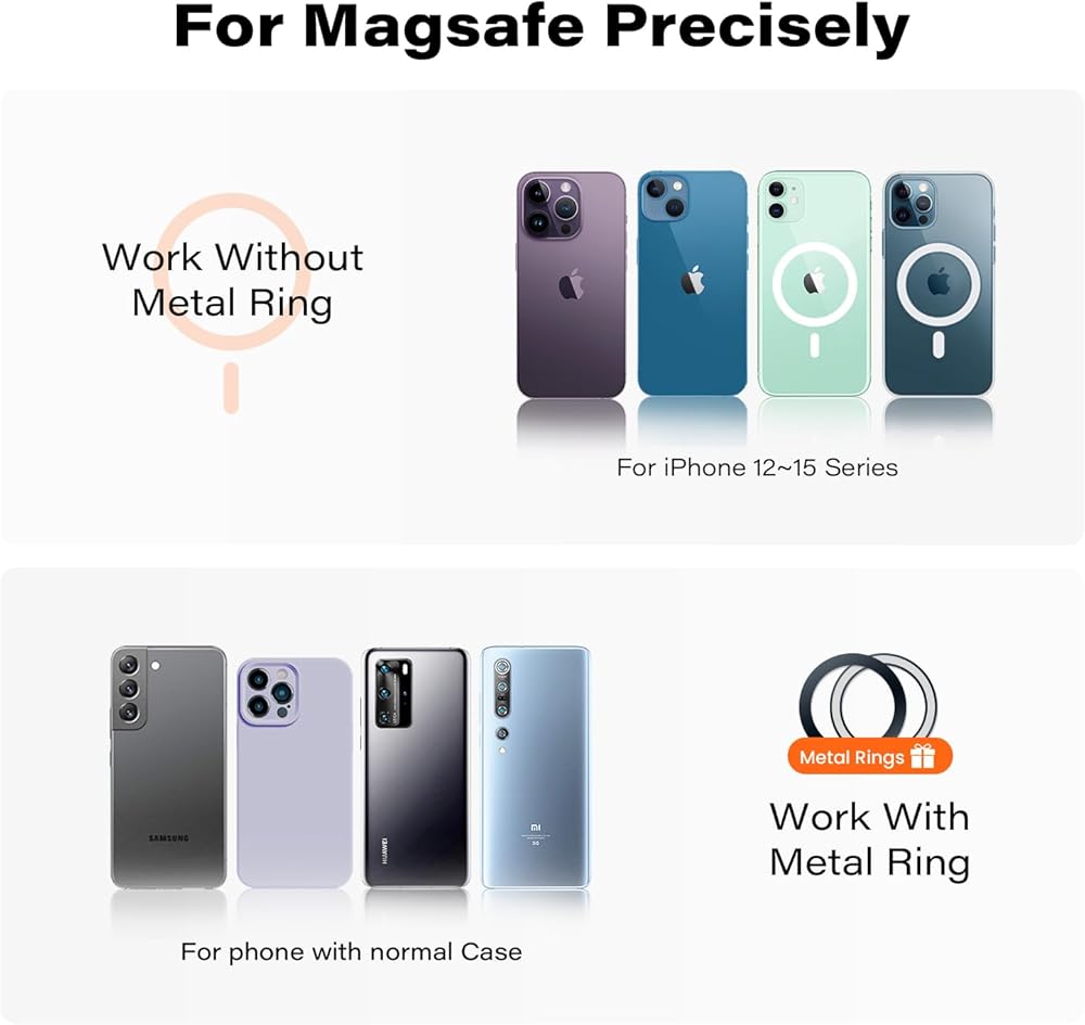 مصمم لسلسلة iPhone 15/14/13/12: تم تصميم مغناطيس حامل الهاتف في السيارة خصيصًا ليناسب سلسلة MagSafe iPhone 12,13,14 و15 بسلاسة. بالنسبة للطرز القديمة وأجهزة Android، يرجى استخدامها مع الحلقة المعدنية المتضمنة ولصقها خارج حافظة الهاتف.
