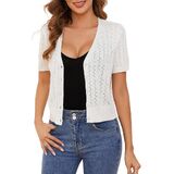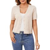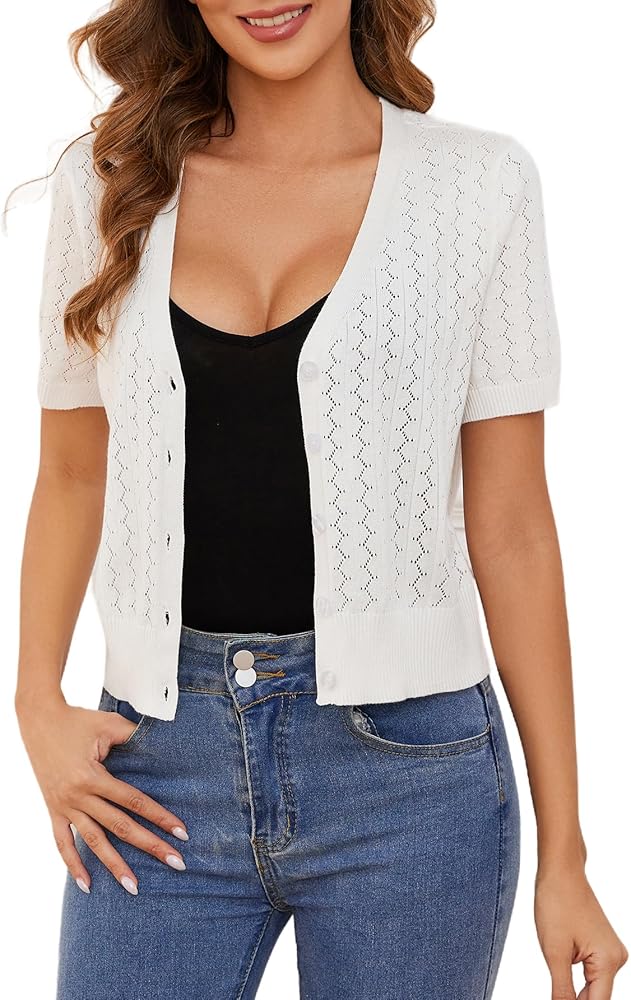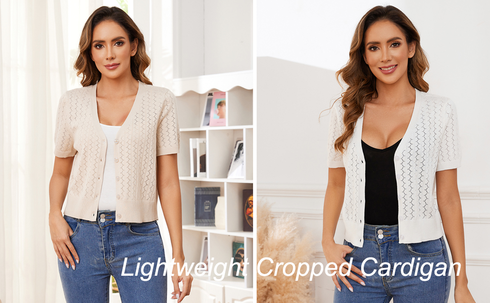 Cropped cardigans for women feature: Our crop cardigan features casual style,charming hollow out design,light weight, short sleeve, sexy vneck, cropped lenght, ribbed knit cuffs and hem, solid color, stretchy, delicate stitching, loose fitted style,soft shrug cardigan. Cropped cardigan sweaters for women is in line with the current trendy, makes you look more attractive