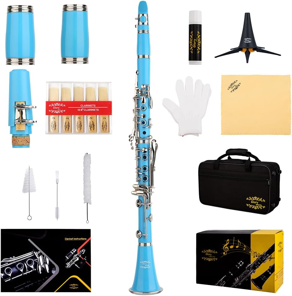 Glory GLY-PBK Professional Ebonite Bb Clarinet with 10 Reeds, Stand, Hard Case, Cleaning Cloth, Cork Grease, Mouthpiece Brush and Pad Brush, Black