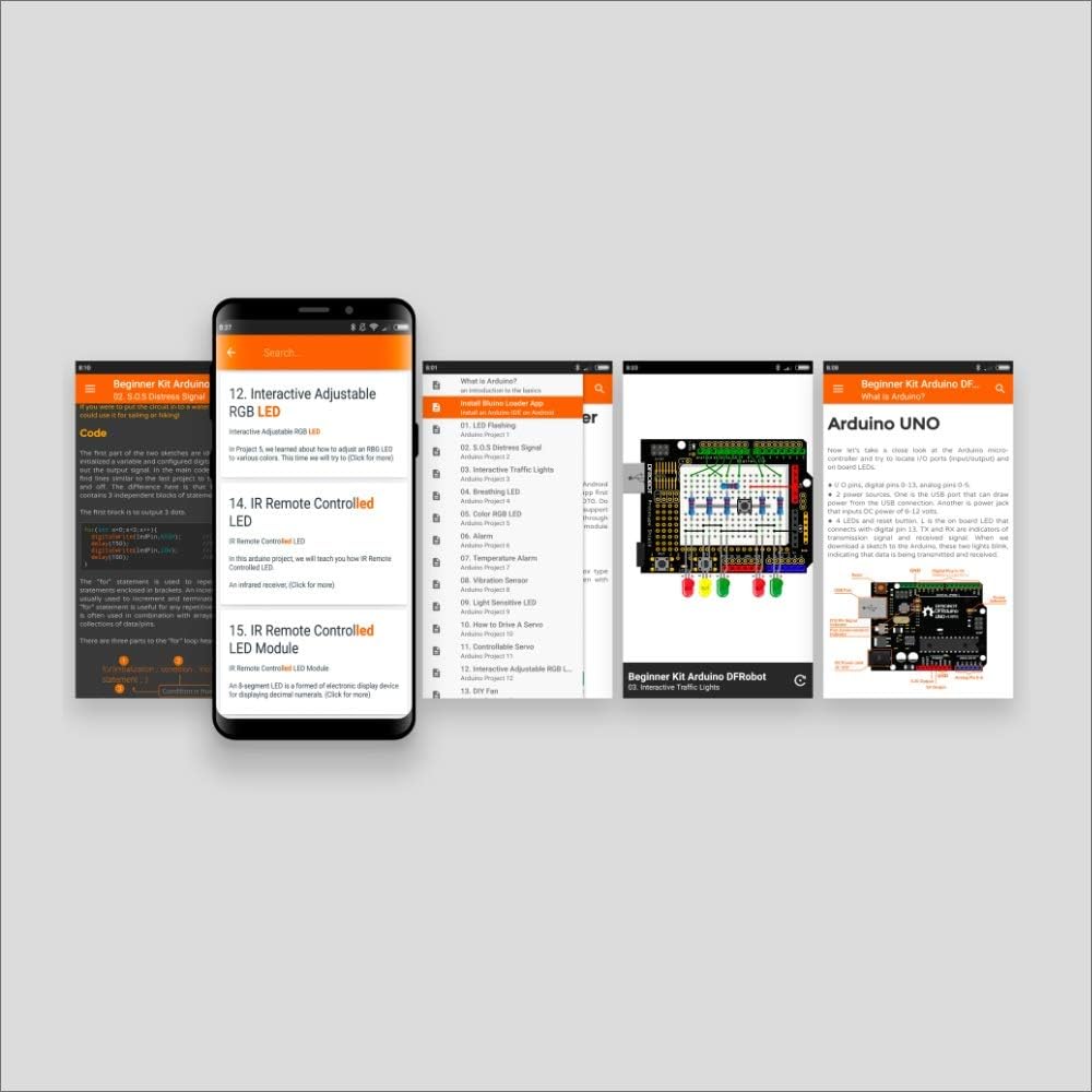 تعلمها في أي وقت: يوجد تطبيق جوال لمجموعة المبتدئين هذه لـ Arduino للعثور على هذه البرامج التعليمية التفصيلية ونموذج التعليمات البرمجية. (يدعم Android 4.0.3 والإصدارات الأحدث فقط، قم بالتنزيل في Google play)