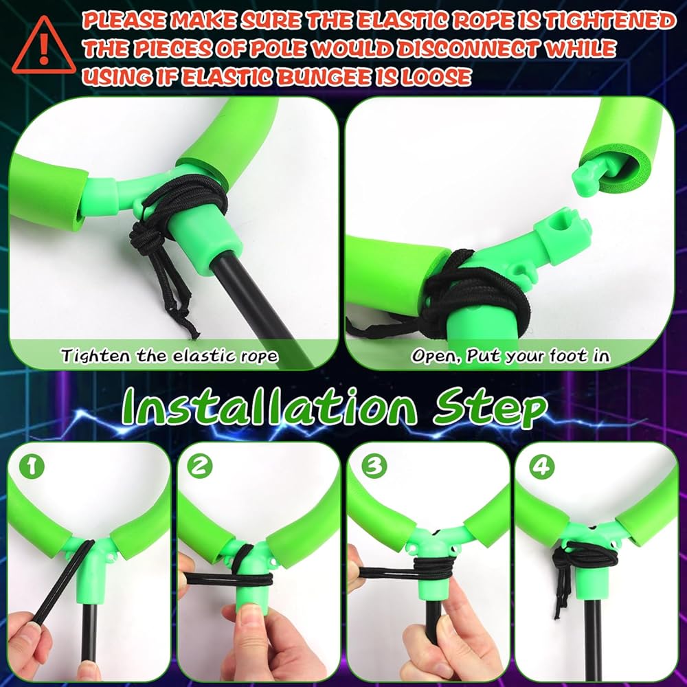 • Super Safe and Sturdy - There is thickened foam wrapped around the ankle ring. No hard pieces, do not hurt kids' feet at all. Built in elastic rope within the pole, no worry about stumbled by rope. Made of high quality ECO material, do not fall apart and last a long time even play by a rough child