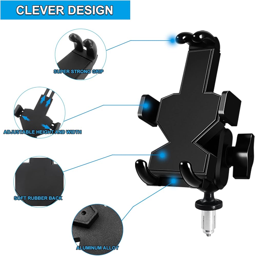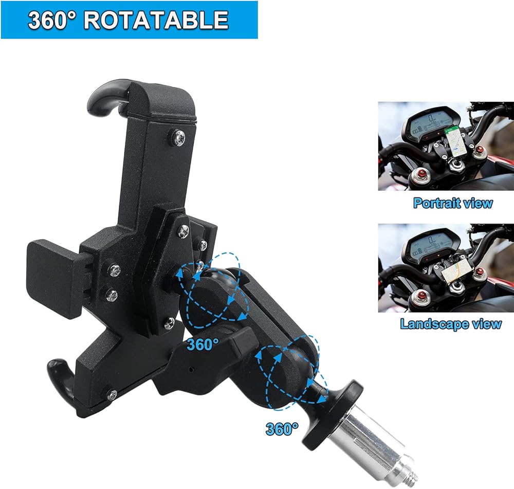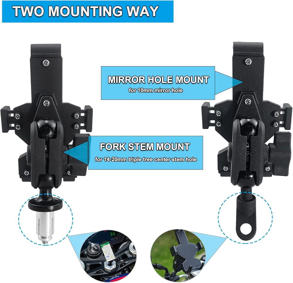 • طريقتان للتركيب - حامل جذع الشوكة وحامل فتحة المرآة. يمكن تركيب حامل هاتف الدراجة النارية هذا في فتحة جذع الشجرة الثلاثية مقاس 14-20 مم أو فتحة مرآة مقاس 10 مم.