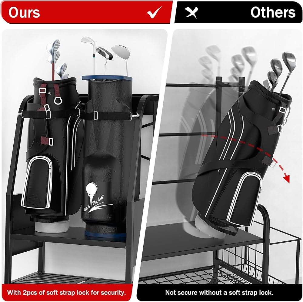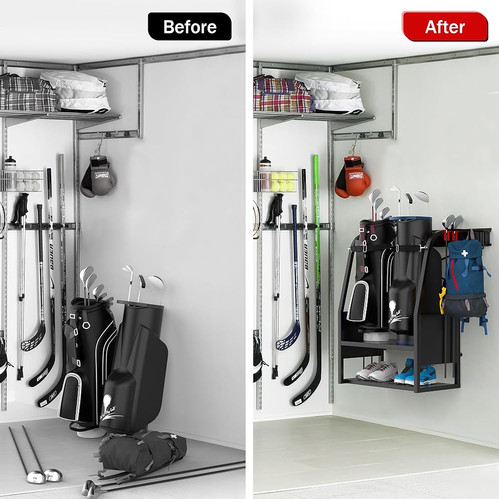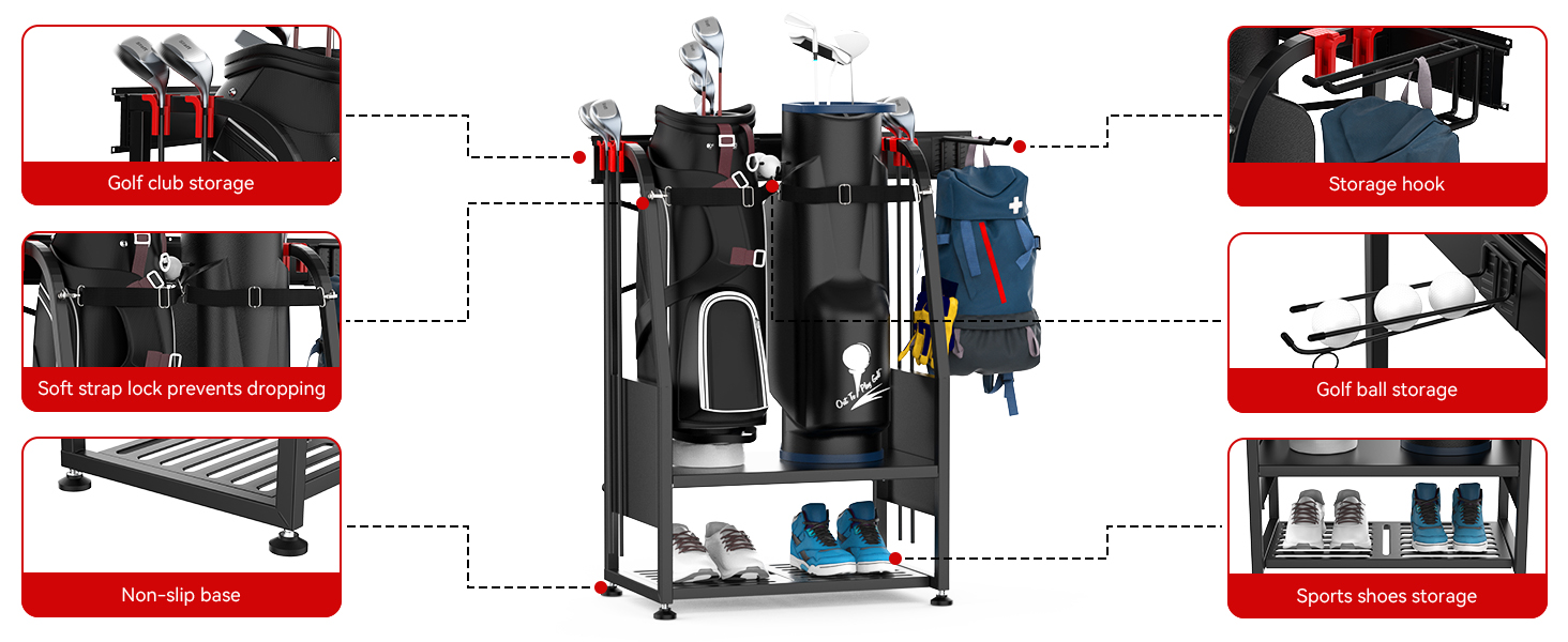 • تصميم بأقدام قابلة للتعديل: ضمان الثبات على الأسطح مثل المرآب أو صالة الألعاب الرياضية أو نادي الجولف أو الطابق السفلي من خلال تسوية رف الجولف بالأقدام القابلة للتعديل. أبعاد منظم الجولف هي 60.96 سم طولًا × 38.1 سم عرضًا × 91.48 سم ارتفاعًا، مما يتسع لحقيبتين جولف بالحجم القياسي.