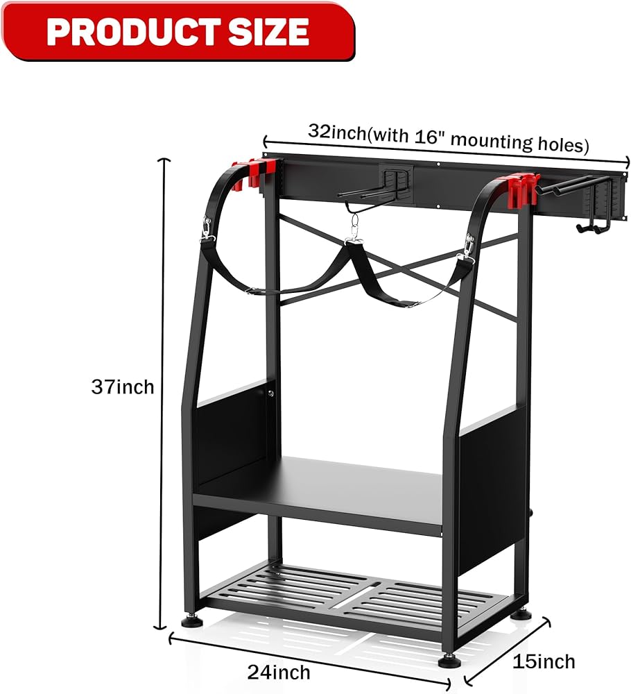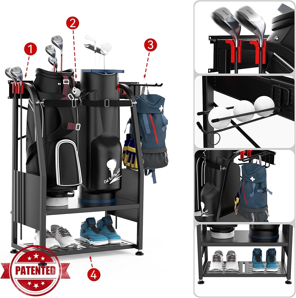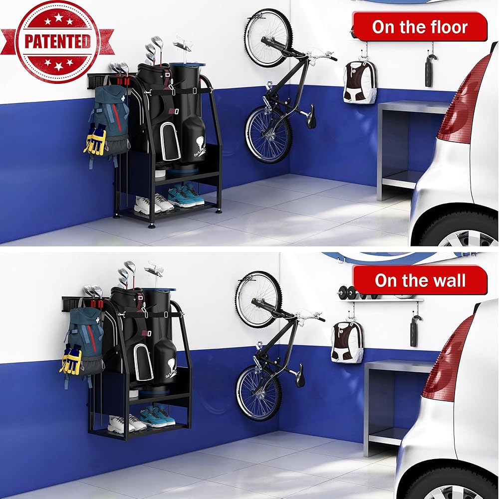 رف تخزين حقيبة الجولف من Ultrawall للجراج، منظم معدات الجولف لحقائب الجولف وملحقاتها، حامل حقيبة الجولف مع أقدام التسوية، تخزين الجولف المثبت على الحائط، أسود