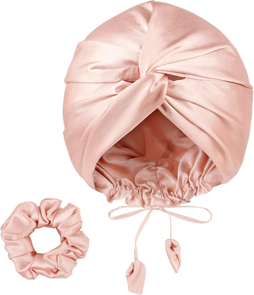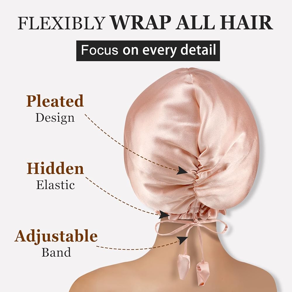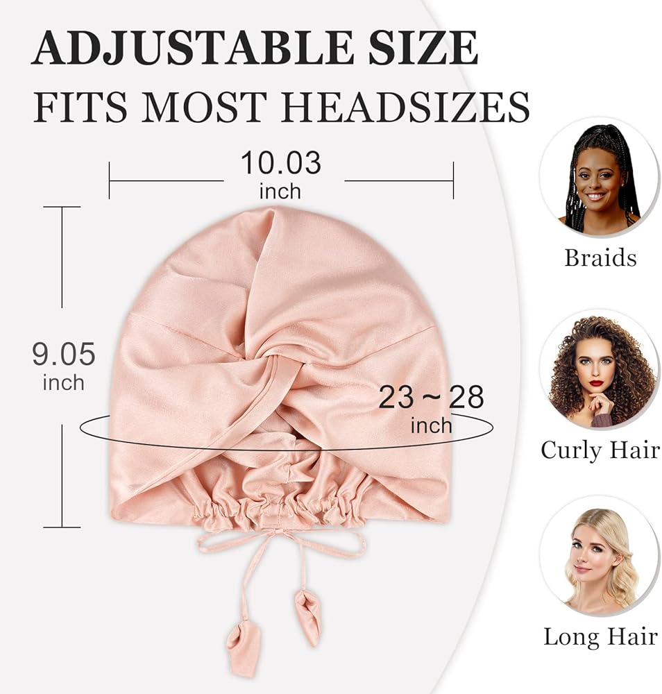 ROOMY AND ADJUSTABLE FOR MOST HAIR TYPES AND SIZES: No matter what hair length or texture you have, you can easily put all your hair into this sleep cap thanks to the elastic bands with great flexibility in this satin hair bonnet. Curly hair, wavy hair, long hair or short hair, all will be covered, including your baby front hair