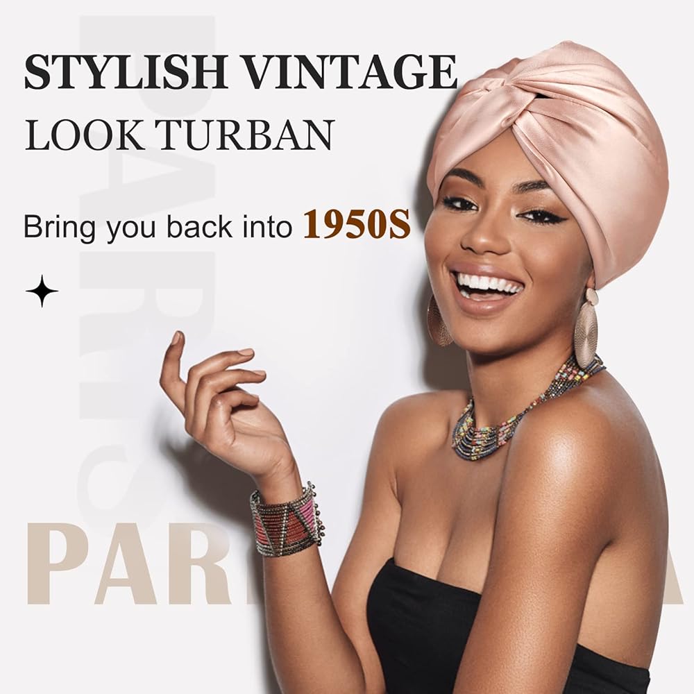1950s IS BACK WITH THIS VINTAGE LOOK SATIN SCARF: Normal bonnet may just be a bonnet for sleeping, but not this one with unique knotted design. This satin turban is both functional and fashionable. Go out like a old movie star, embrace the old-time fashion, enjoy an all-day hair protection. Show time, baby!