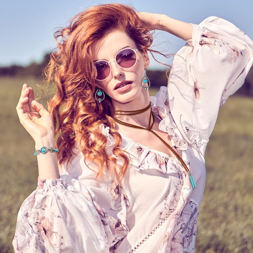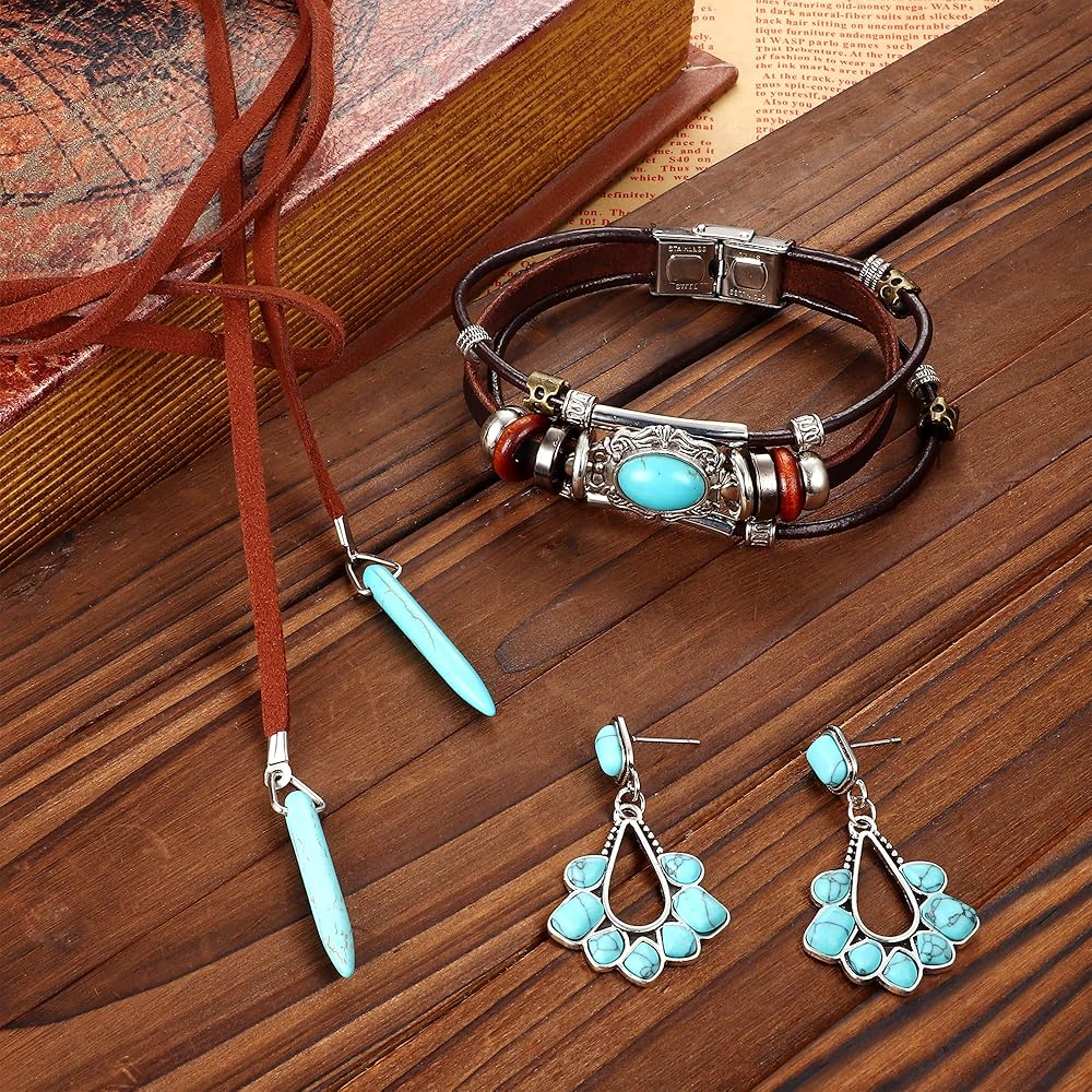 Subiceto مجوهرات الغربية للنساء البوهيمي الفيروزي بوهو الفيروز قلادة طويلة المختنق خمر الفيروز تتدلى الأقراط الفيروز فو الجلود الطبقات الأساور مجموعة المجوهرات الغربية