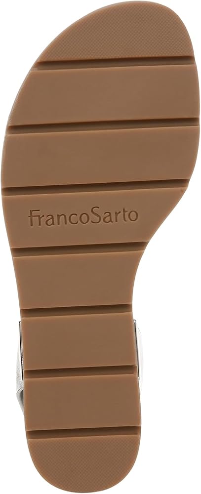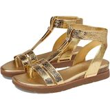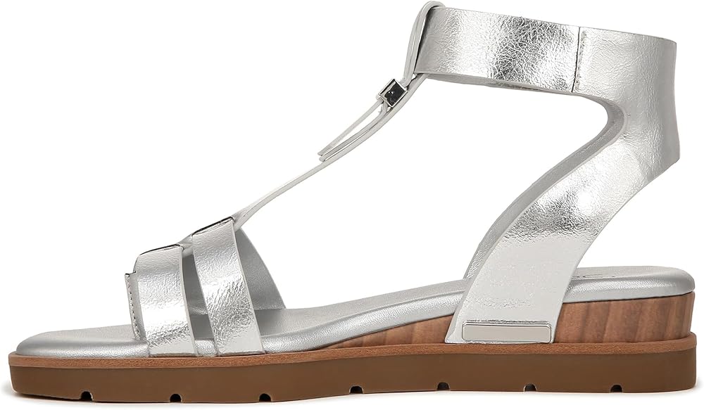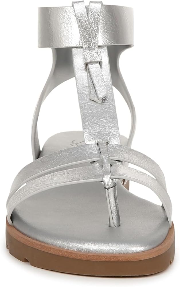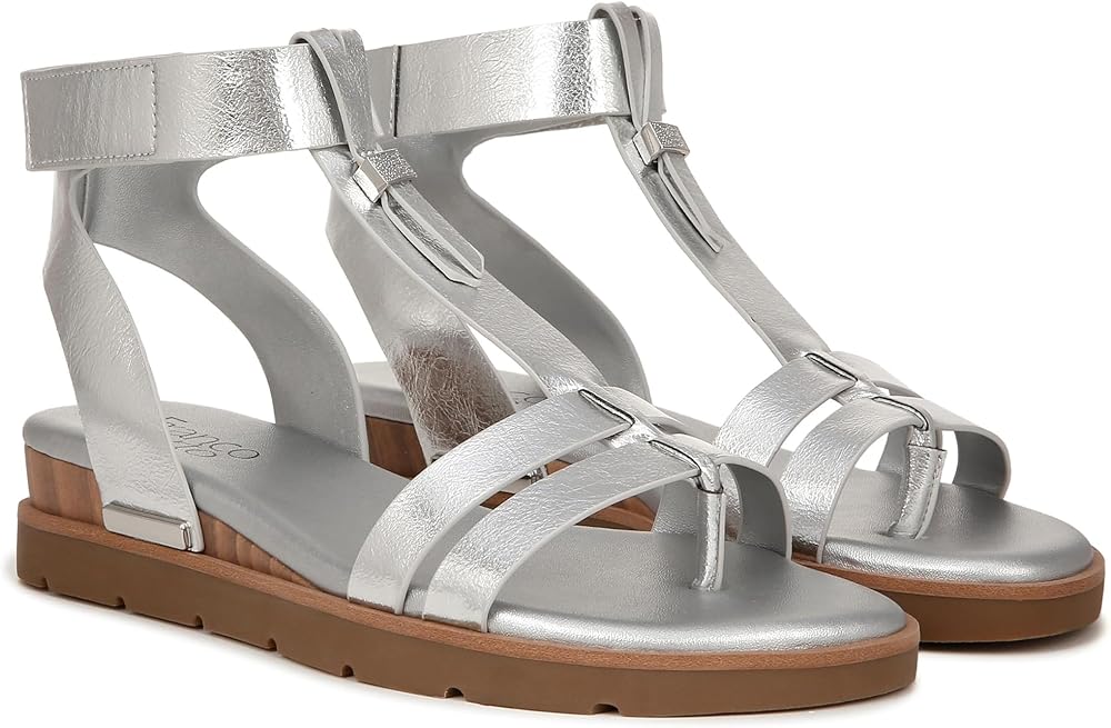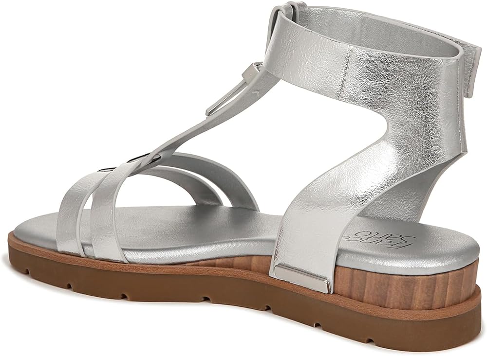 Gladiator-inspired sandals for women with handcrafted details that master the art of sport chic. Faux leather upper partially made from partially recycled materials. Eco-conscious linings with soft + sustainable comfort. Ankle strap with adjustable hook and loop closure. Open toe with hidden thong post. Metallic bar strap detailing. 1.5 inch wedge heel, 0.5 inch sport sole.