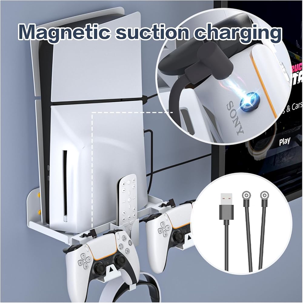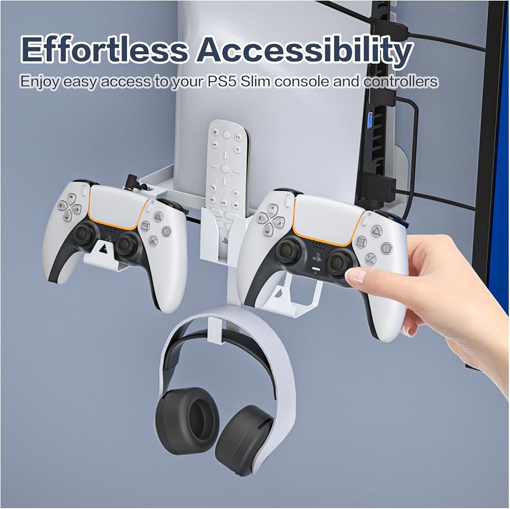 𝗘𝗳𝗳𝗼𝗿𝘁𝗹𝗲𝘀𝘀 𝗔𝗰𝗰𝗲𝘀𝘀𝗶𝗯𝗶𝗹𝗶𝘁𝘆: استمتع بسهولة الوصول إلى وحدة التحكم ووحدات التحكم PS5 Slim. يسهل حامل الحائط هذا إعداد ألعاب مرتب، ويستوعب وحدتي تحكم PS5، وسماعة رأس واحدة، وجهاز تحكم عن بعد للوسائط لسهولة التخزين وسهولة الوصول.