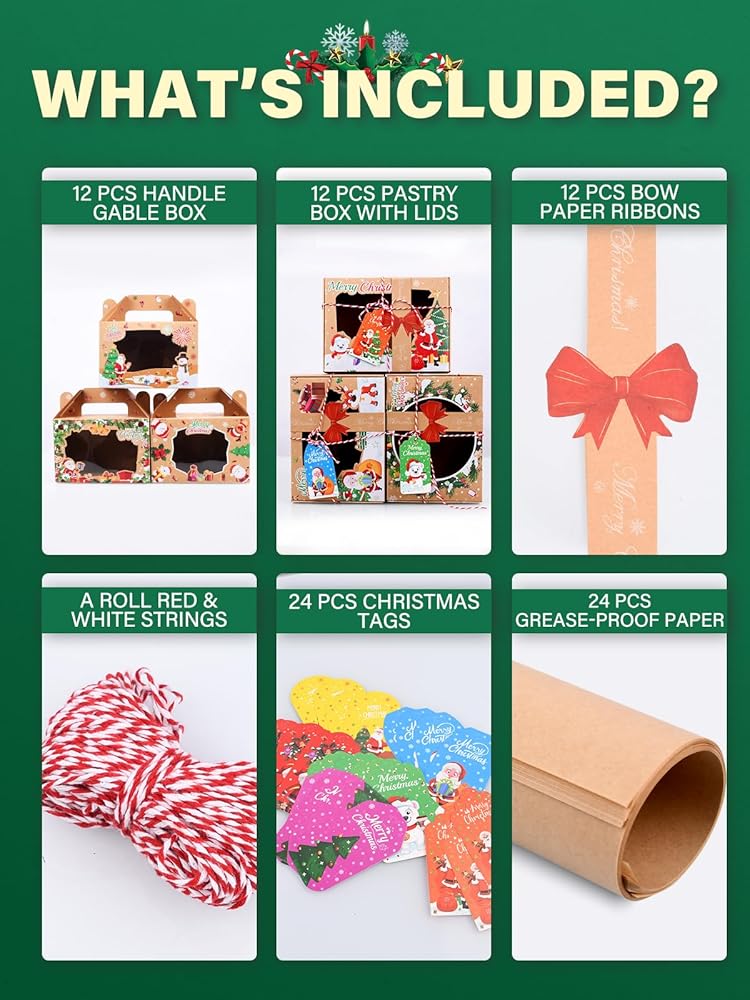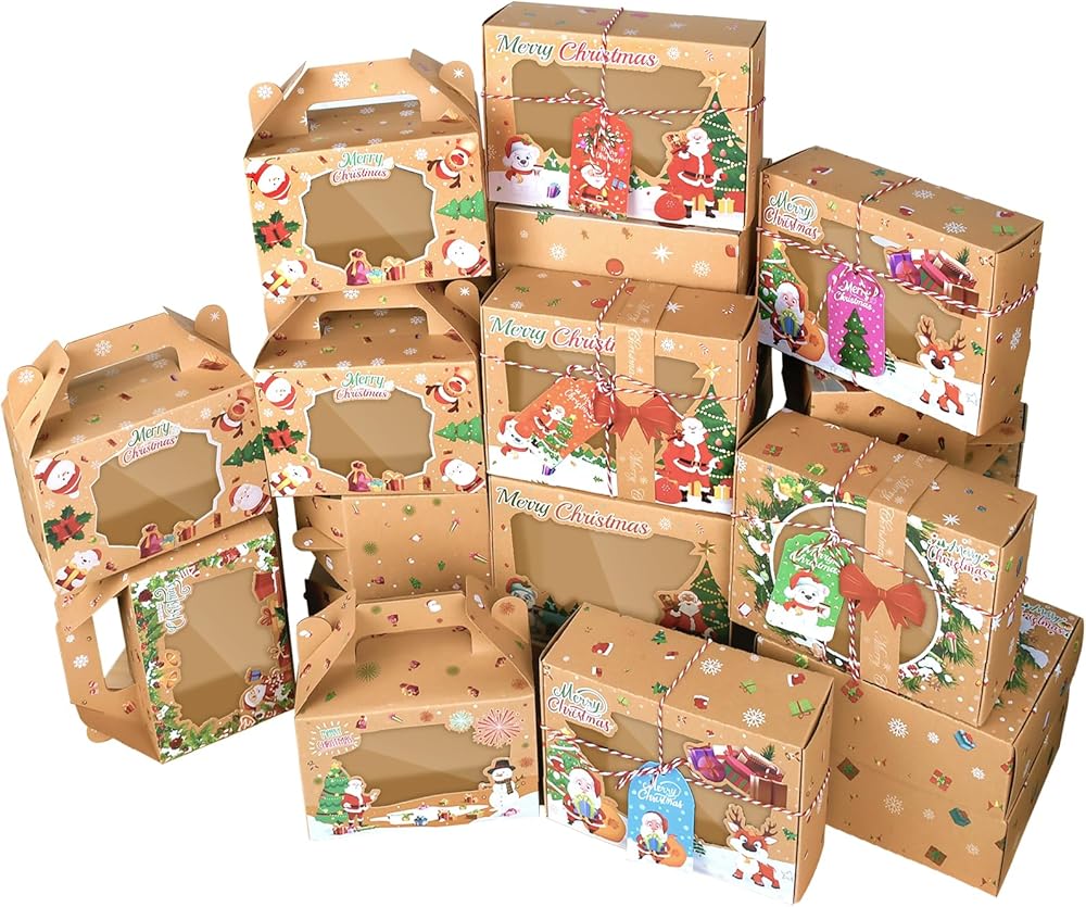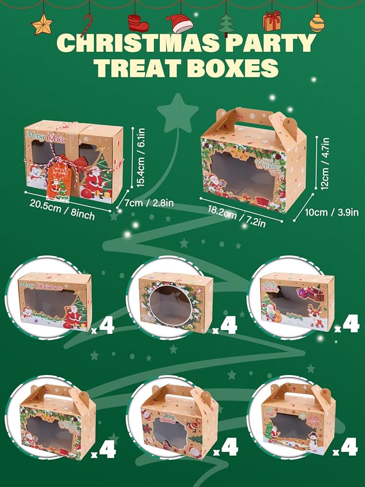 صناديق بسكويت عيد الميلاد لتقديم الهدايا، 24 عبوة من صناديق حلوى مخبوزات طعام عيد الميلاد مع نافذة حاوية مثالية للحلوى/الكب كيك/الجبن/الحلوى/البسكويت/البراونيز، صندوق هدايا للحفلات