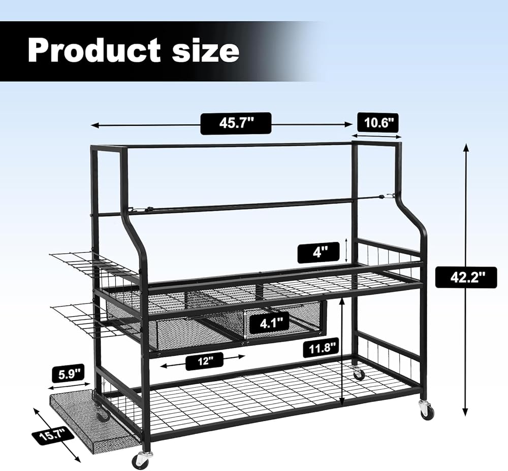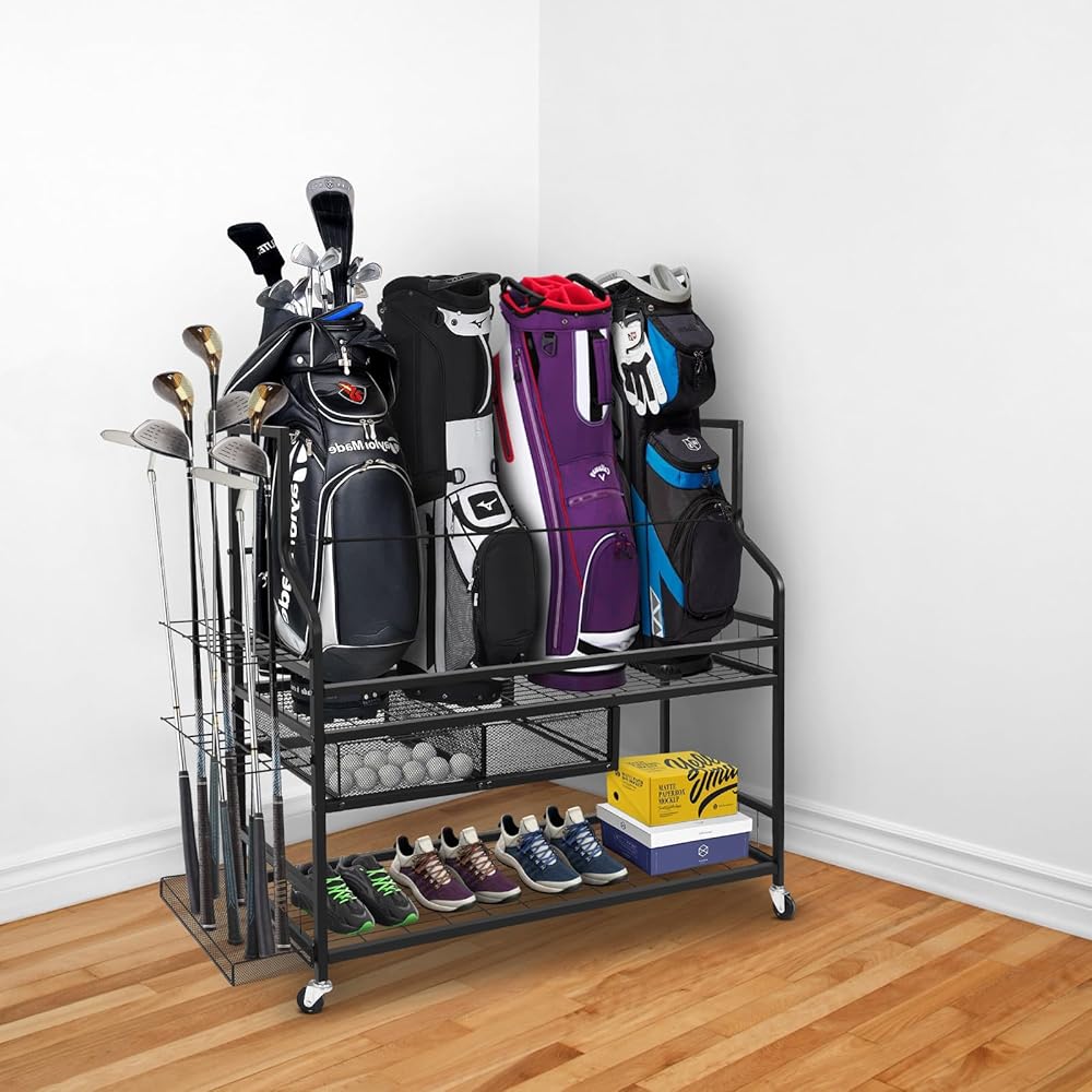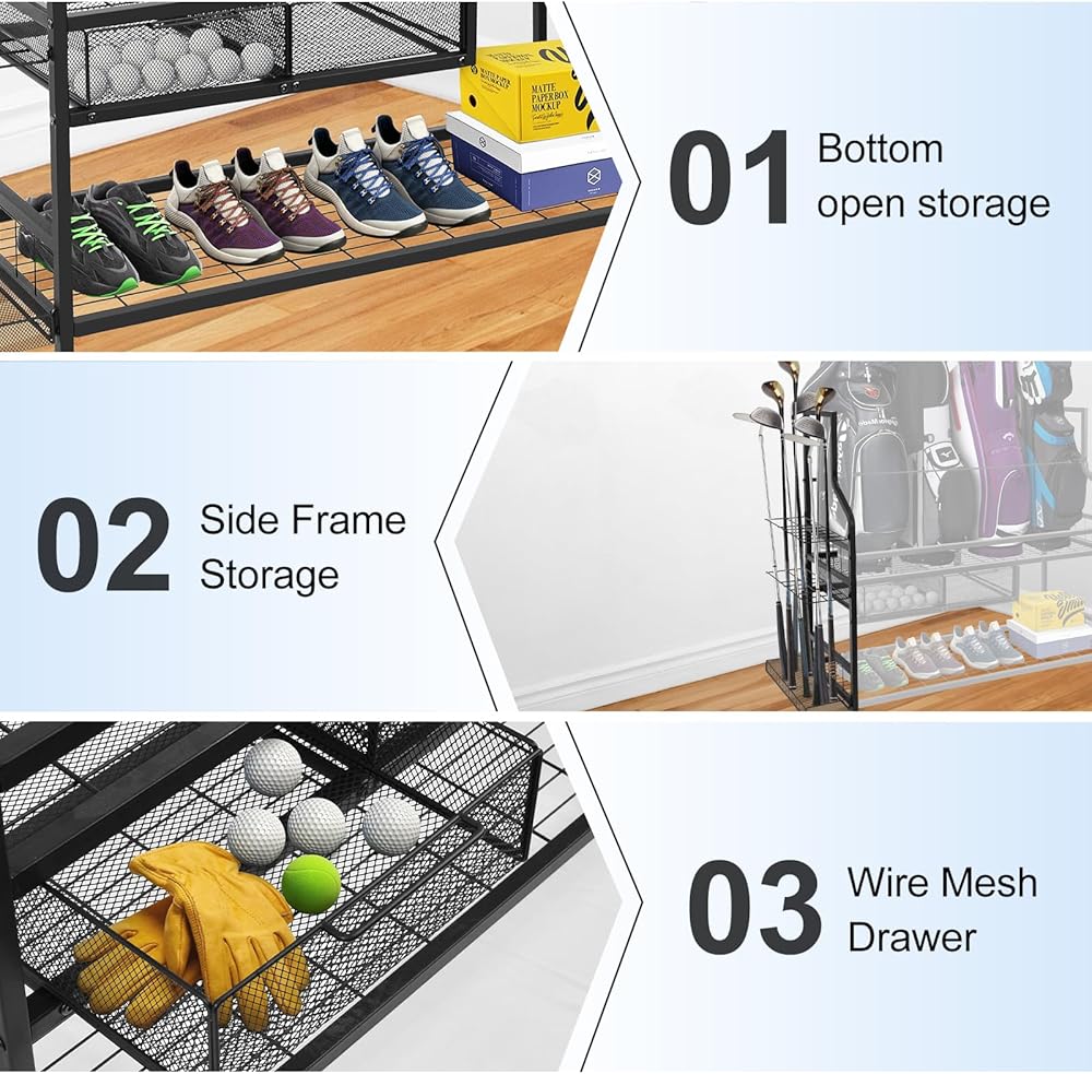 【هيكل معدني ممتاز】مصنوع من معدن عالي الجودة، يوفر رف تخزين الجولف هذا دعمًا قويًا لمعداتك، مما يجعله مثاليًا للجراجات والمنازل والنوادي والأقبية.