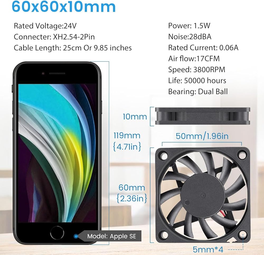 【60mm Fan】Dimension: 60mm x 60mm x 10mm / 2.37x2.37x0.4 in. per fan; Rated Voltage:24V 0.06A; Speed: 3800RPM; Air flow: 17CFM; Noise:28dBA; Connecter: XH2.54-2Pin; Cable Length: 25cm Or 9.85 inches