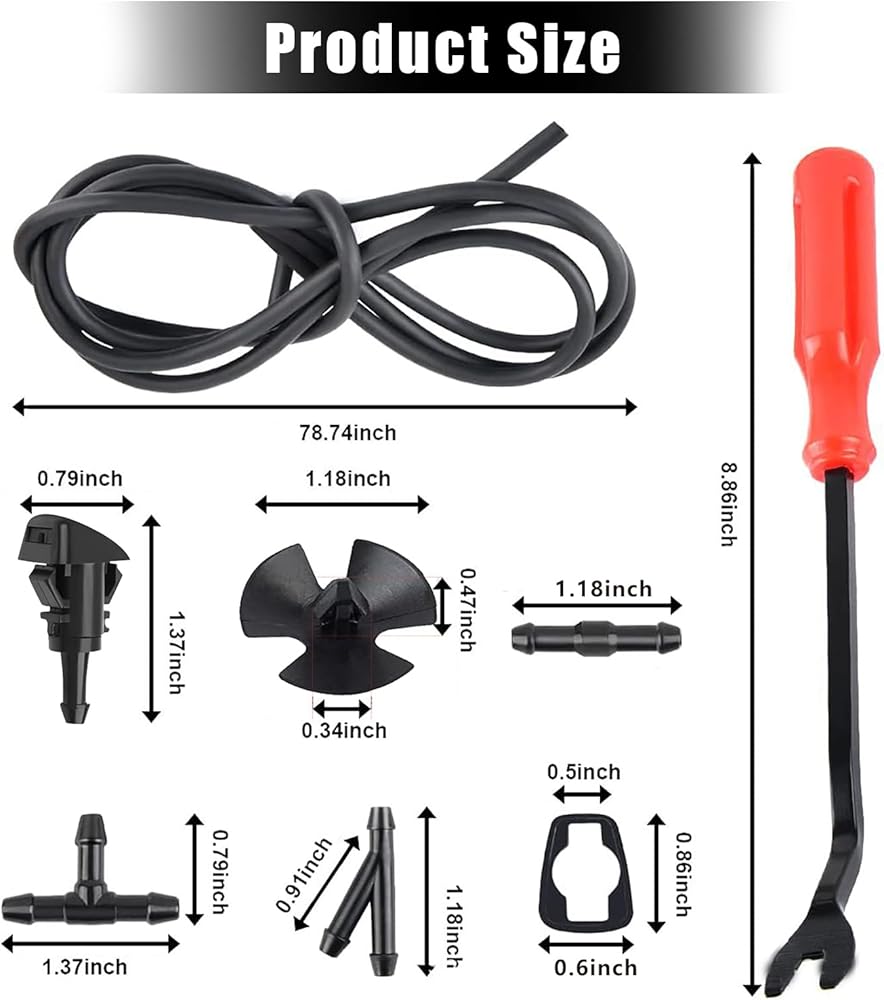 • Package & Install: The package comes with 1 piece 6.5 ft windshield washer hose, 4 pieces windshield washer nozzles, 4 pieces rubber gaskets, 3 pieces windshield wiper hose connectors and 30 pieces hood insulation retainers in total. Easy to install, and can fit securely on wash pumps, connectors, and washer nozzles. The tough fastener remover with lightweight and ergonomic design.