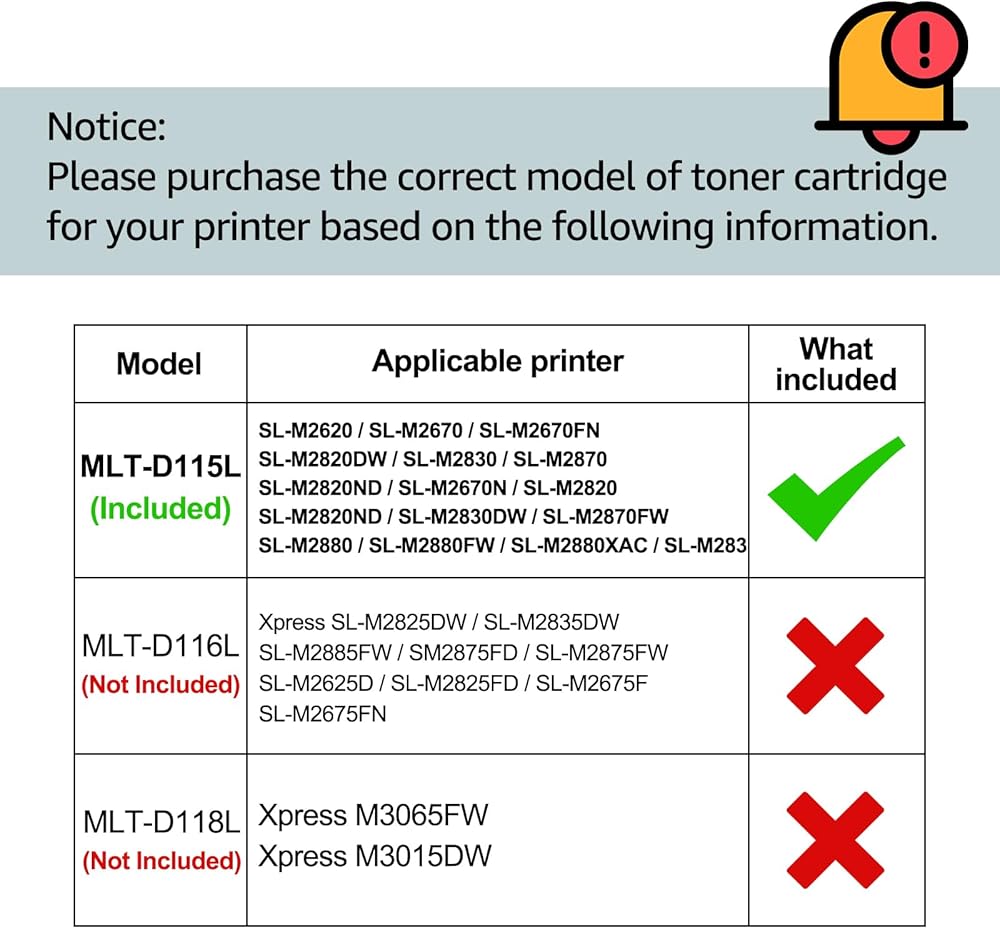 Page Yield: Up to 3,000 pages per MLT-D115L black toner cartridge (based on 5% coverage of Letter size Paper). Actual toner yield varies with usage, graphics printed and environmental conditions.