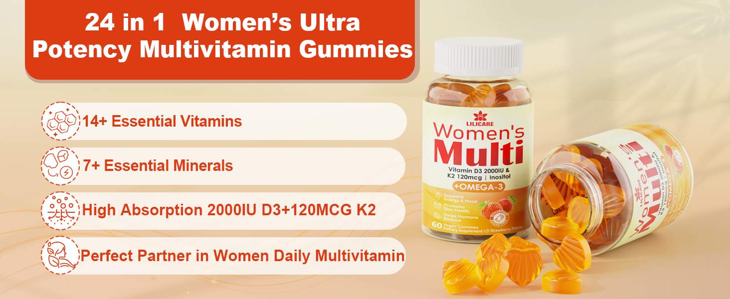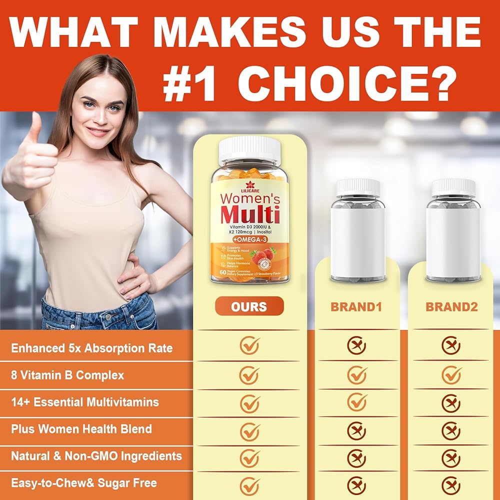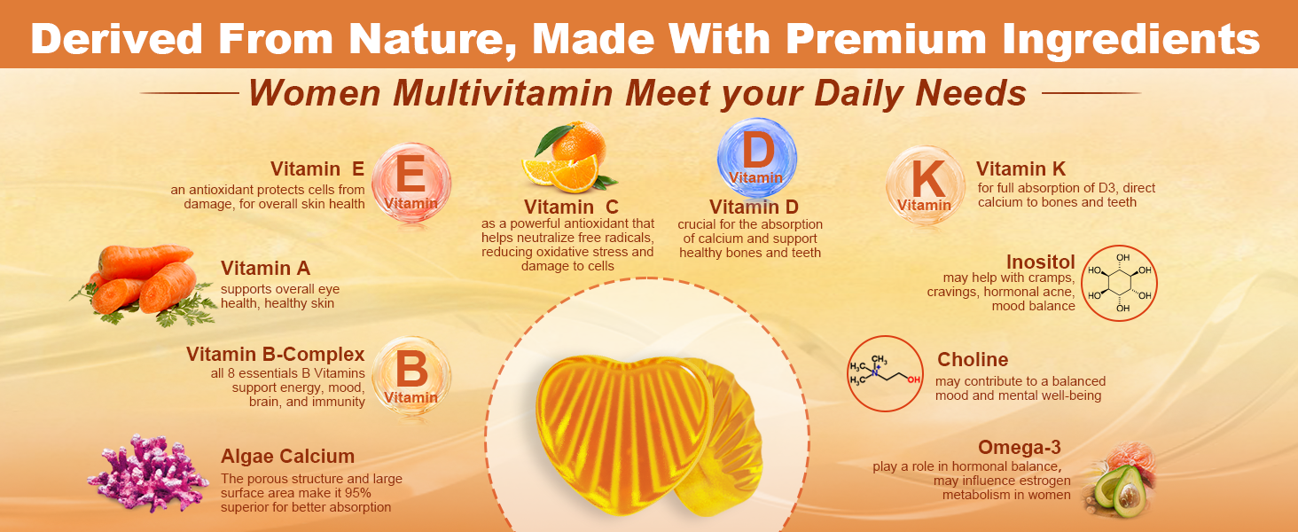 فيتامينات متعددة ومعادن متعددة للسيدات: توفر الفيتامينات المتعددة الفيتامينات والمعادن الأساسية الأساسية لتلبية احتياجاتك اليومية أو تجاوزها. علكات الفيتامينات المتعددة للنساء تحتوي على أكثر من 20 فيتامينًا ومعادن ومغذيات أساسية لدعم الصحة والعافية بشكل عام. بما في ذلك الجرعة والإينوزيتول لصحة الجلد، وفيتامين د3 + ك2 لعظام قوية، وأوميجا 3 للنساء، وفيتامينات ب لتعزيز الطاقة وتخفيف الحالة المزاجية. إنها تركيبة تشعرك بالسعادة وسيحبها جسمك!
