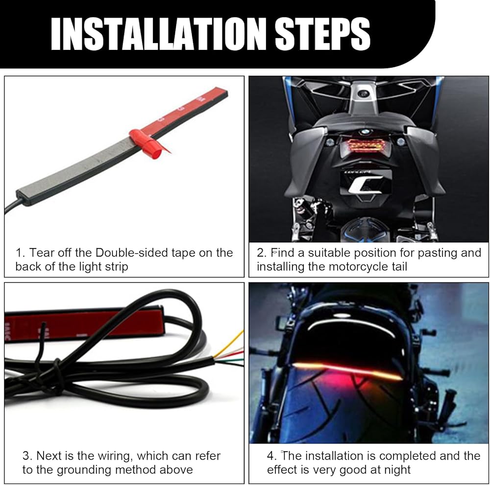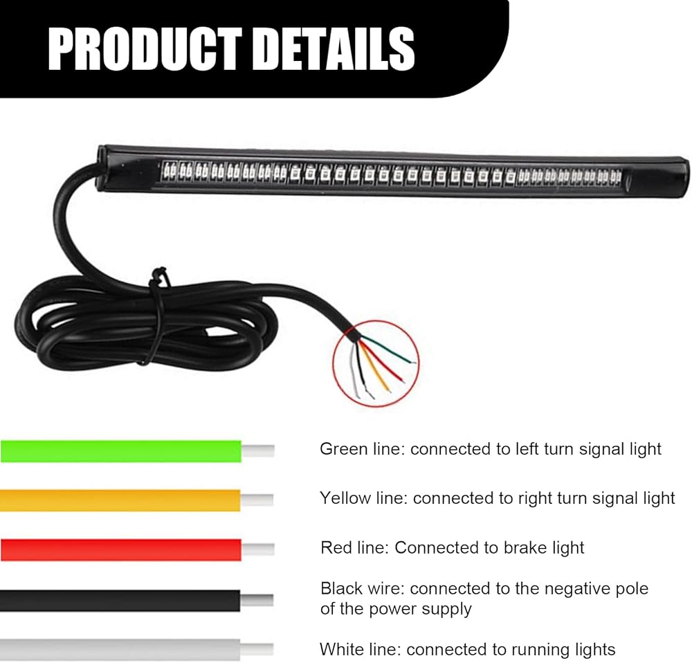 How to use: The light strip adopts self-adhesive installation, just tear off the self-adhesive adhesive and stick it. The green wire is connected to the left turn signal, the yellow wire is connected to the right turn signal, the red wire is connected to the brake light, the black wire is connected to the negative pole of the power supply, and the white wire is connected to the running light.