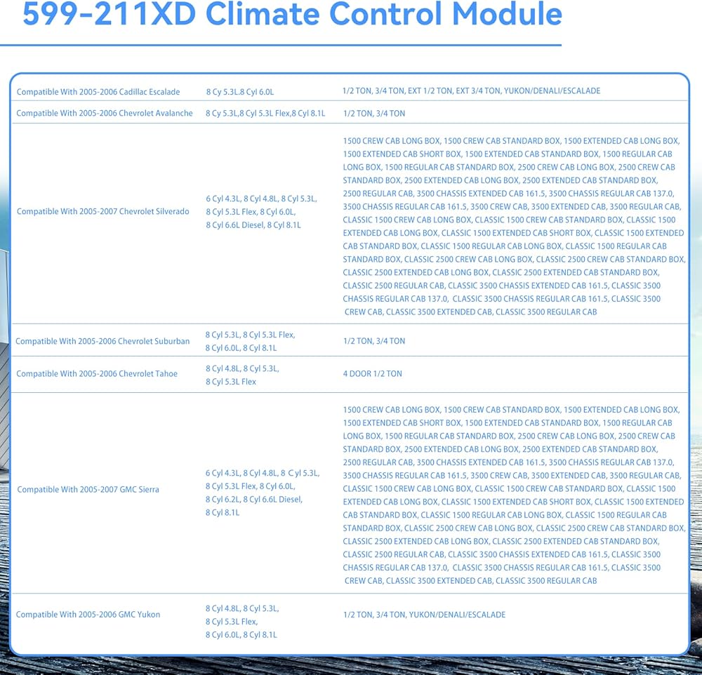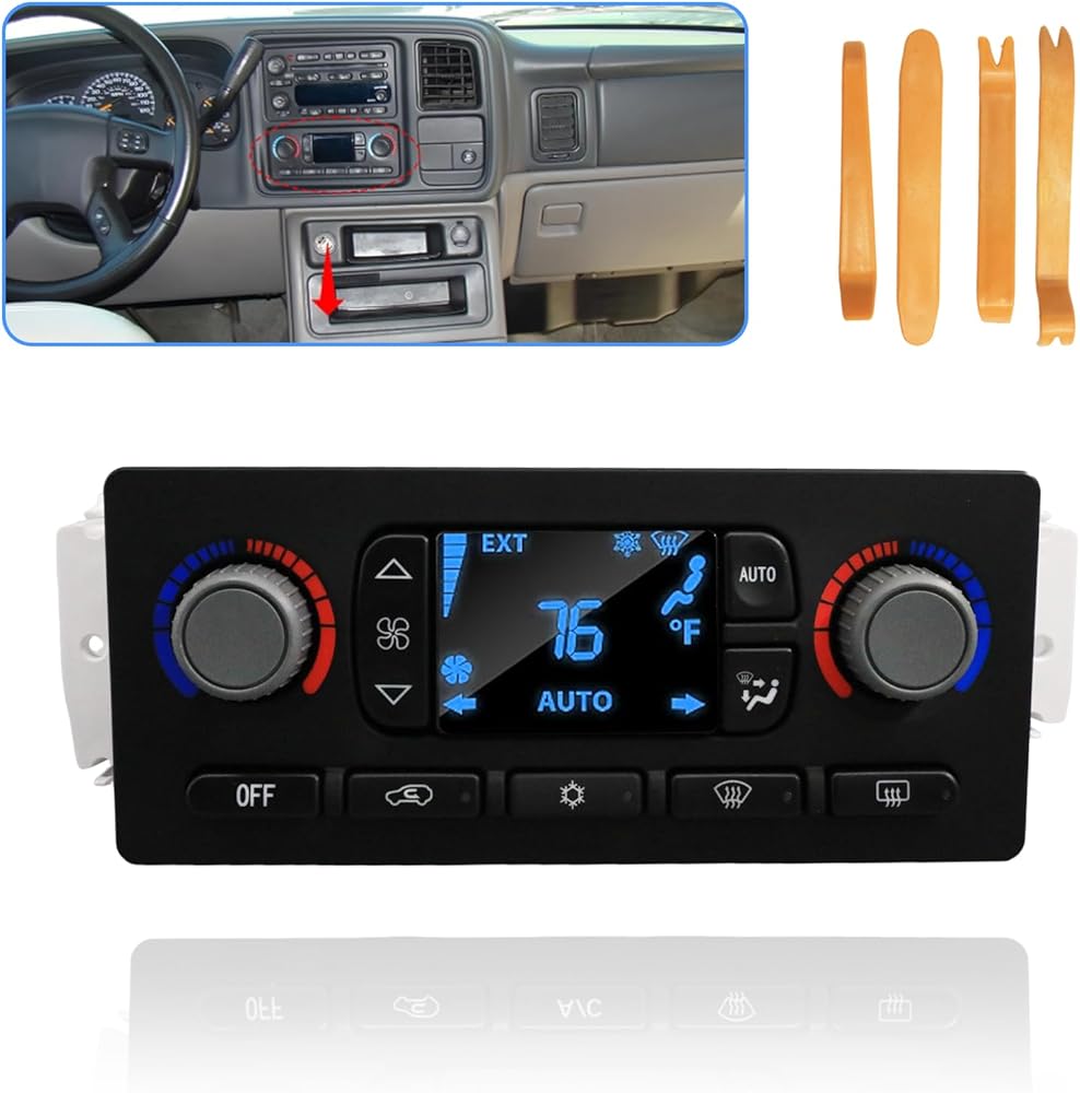 【Compatible with】 Controls the heating, ventilation, and air conditioning (HVAC) system in select Chevrolet and GMC vehicles.Compatible with: 2003-2007 Chevy Silverado; 2003-2006 Chevy Avalanche; 2003-2006 Chevy Suburban; 2003-2006 Chevy Tahoe; 2003-2007 Chevy Silverado; 2002-2009 Chevy Trailblazer; 2003-2007 GMC Sierra; 2003-2006 GMC Yukon; 2002-2009 GMC Envoy; 2003-2007 H2; 2004-2007 Buick Rainier; 2003-2006 Cadillac Escalade; 2002-2004 Oldsmohile Bravada.