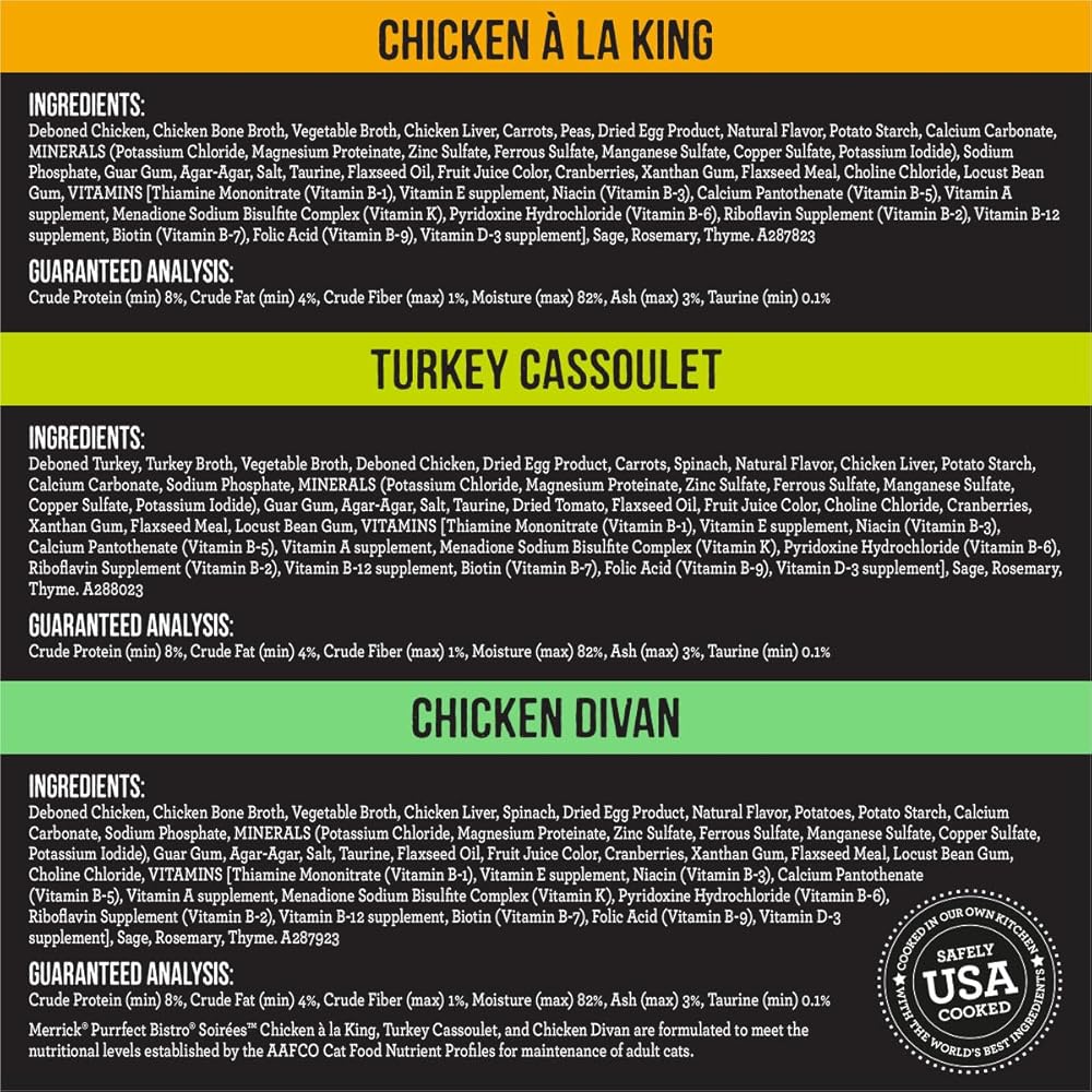 Merrick Purrfect Bistro Soirees Variety Pack, Turkey Cassoulet, Chicken Divan, And Chicken a la King Recipes With Gravy. Grain Free Premium Natural Cat Food With Added Vitamins, Minerals And Nutrients